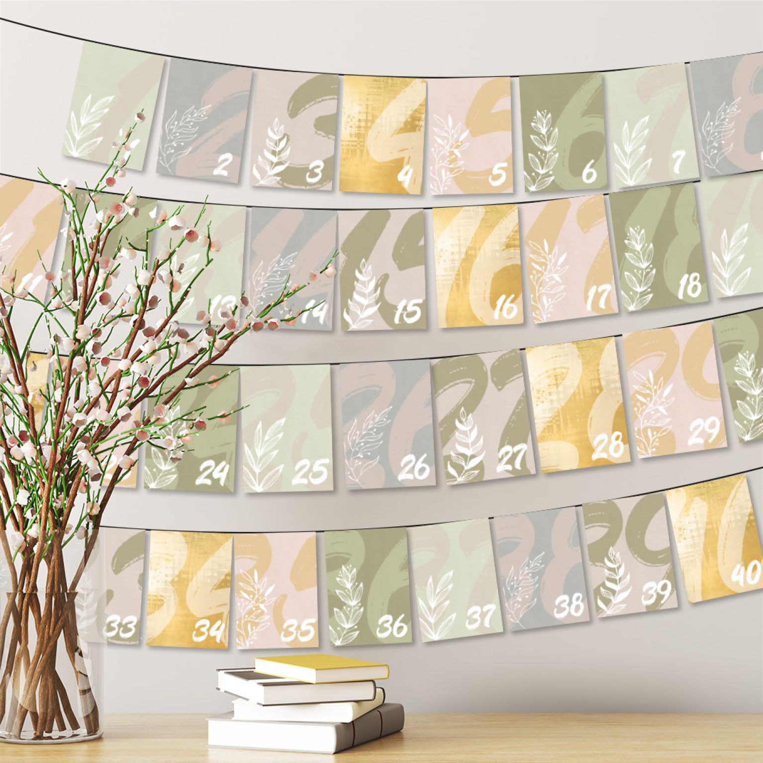 - 40 kaartjes met het nummer van de dag en op de achterzijde een bemoedigende (bijbel)tekst, lied of quote