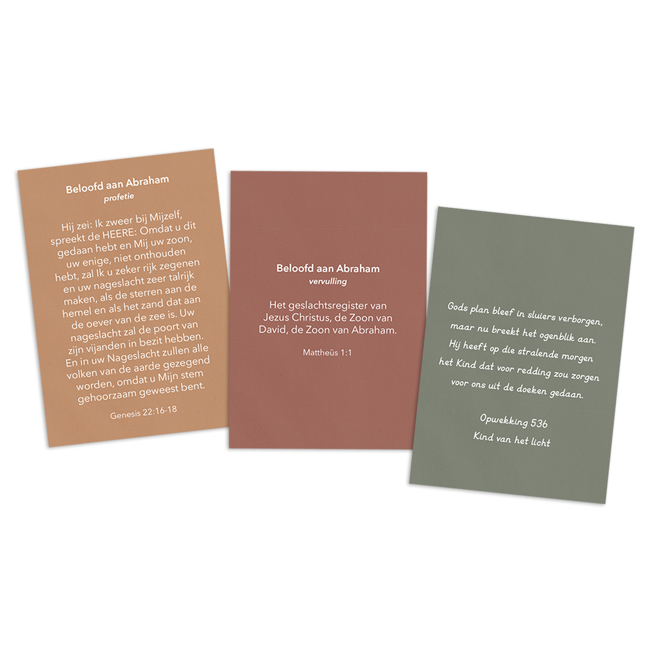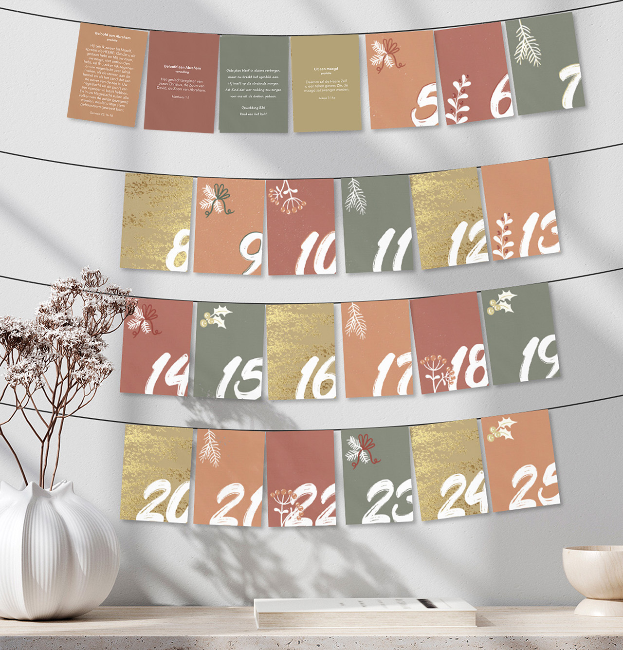 Adventsslinger om bewust naar Kerst toe te leven. Draai elke dag van de adventstijd een kaartje om en verwonder je over Gods grote plan voor deze wereld.