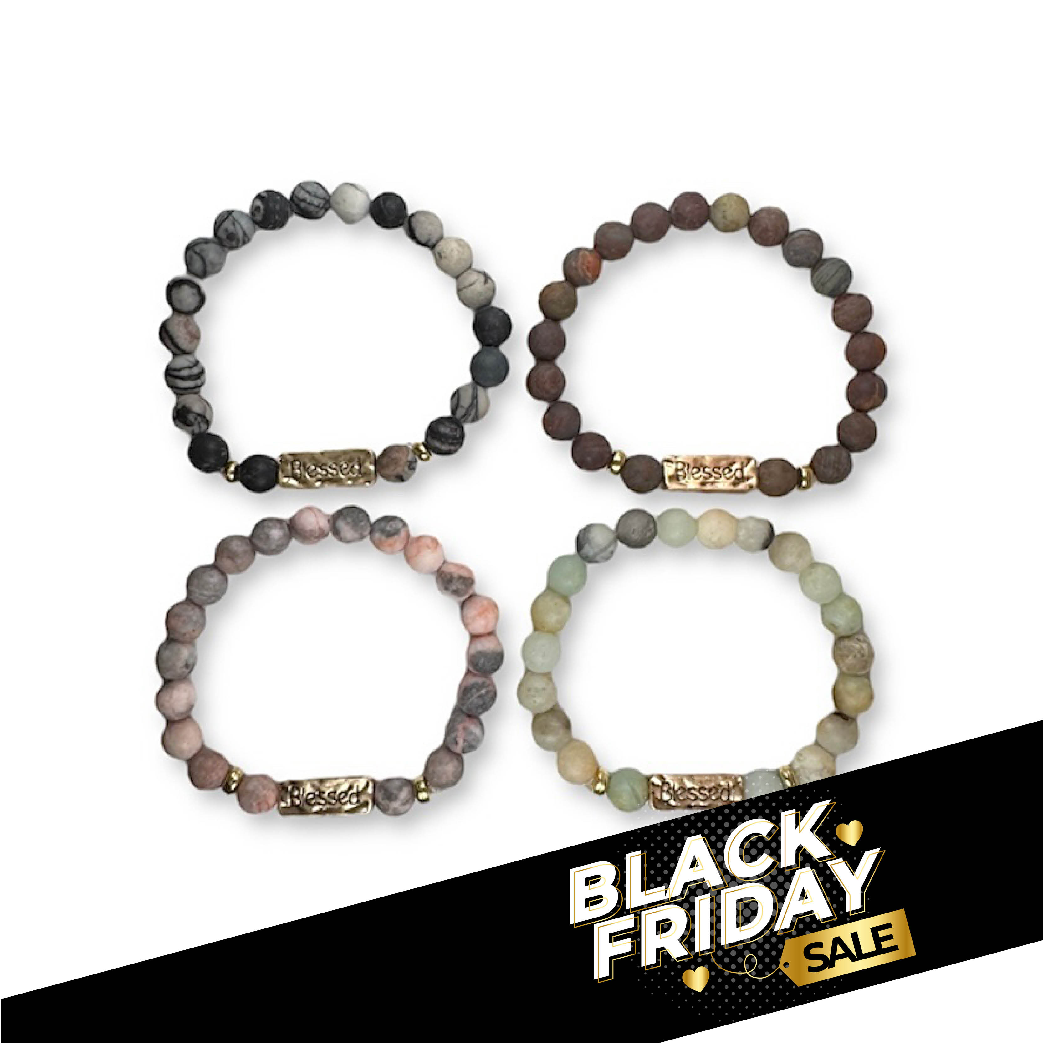 Prachtige natuurstenen armband met goudkleurige accenten en de gravure ‘Blessed’.