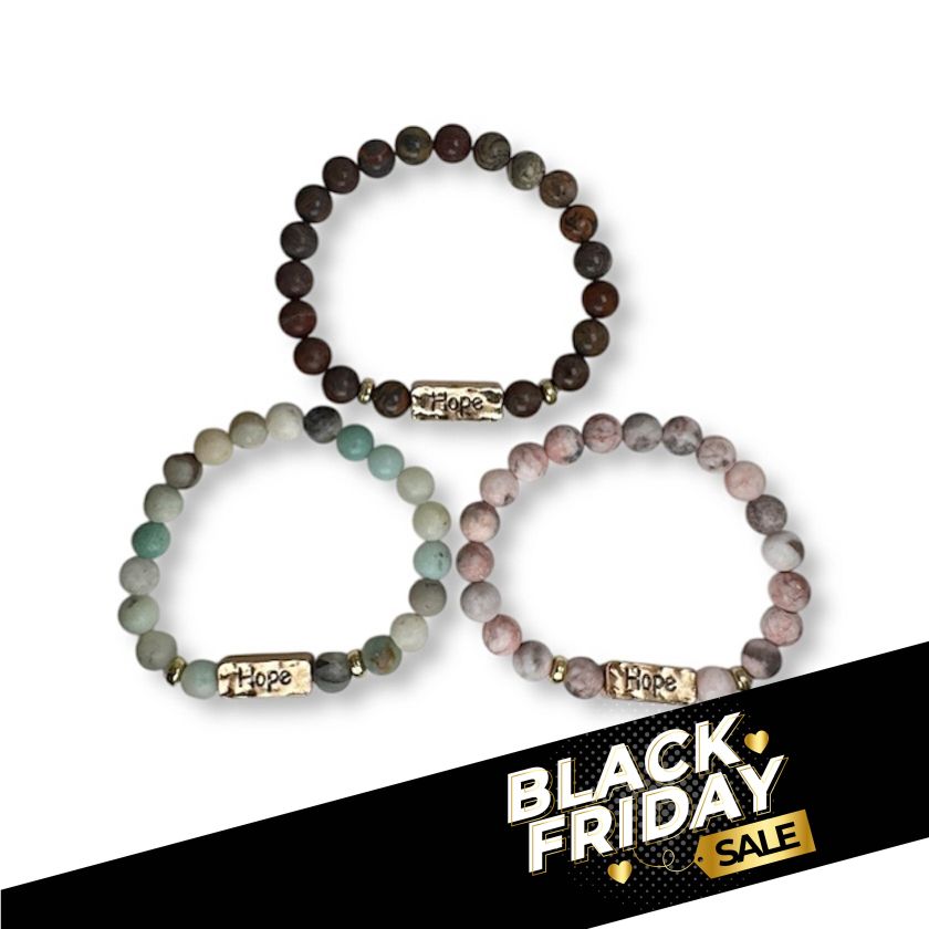 Prachtige natuurstenen armband met goudkleurige accenten en de gravure ‘Hope’.