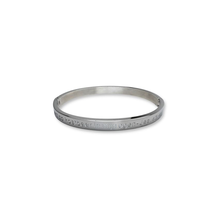Draag een krachtige boodschap om je pols met deze elegante bangle, gegraveerd met de geliefde bijbeltekst uit Jesaja 43:4: ‘Jij bent zo kostbaar in mijn ogen.’ Verkrijgbaar in goud- en zilverkleur.
