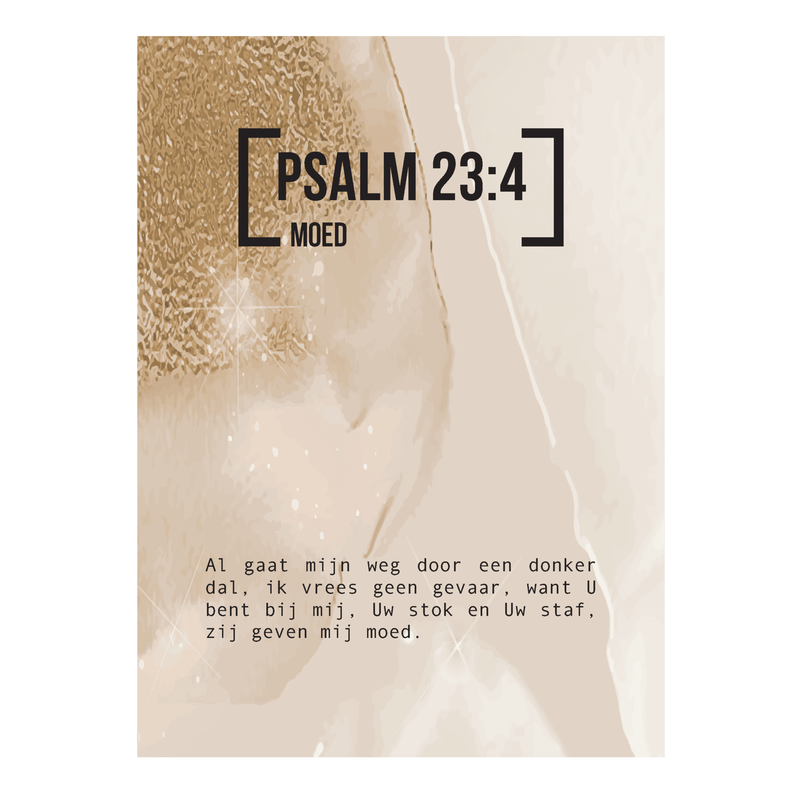 Psalm 23:4: ‘Al gaat mijn weg door een donker dal, ik vrees geen gevaar, want U bent bij mij, Uw stok en Uw staf, zij geven mij moed’.’ (NBV21)