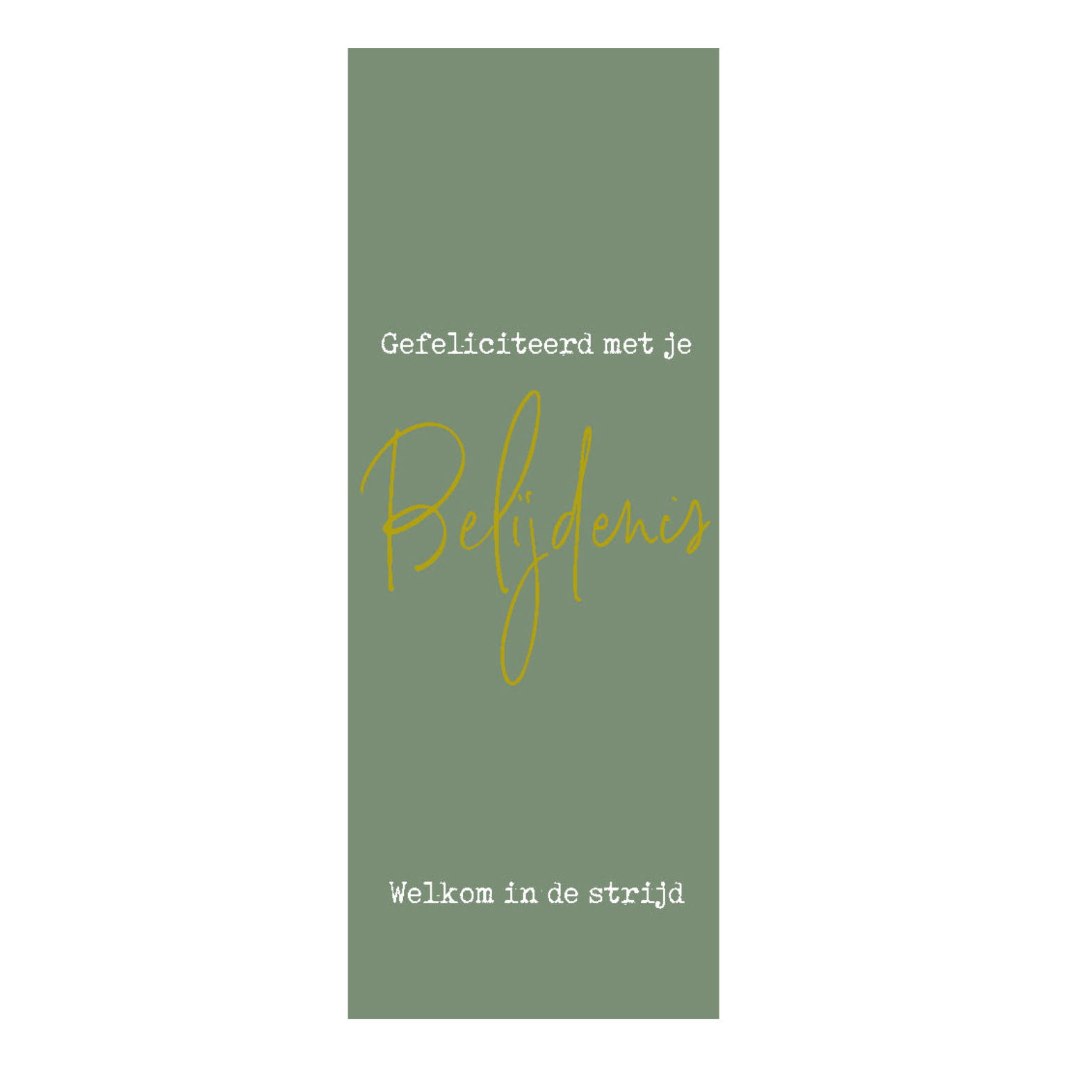 Luxe boekenlegger met de tekst: ‘Gefeliciteerd met je belijdenis. Welkom in de strijd’.