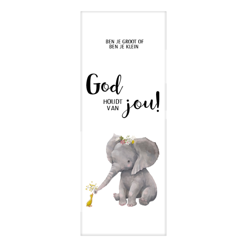 Boekenlegger met vrolijke afbeelding van een diertje en een verwijzing naar een kinderliedje.