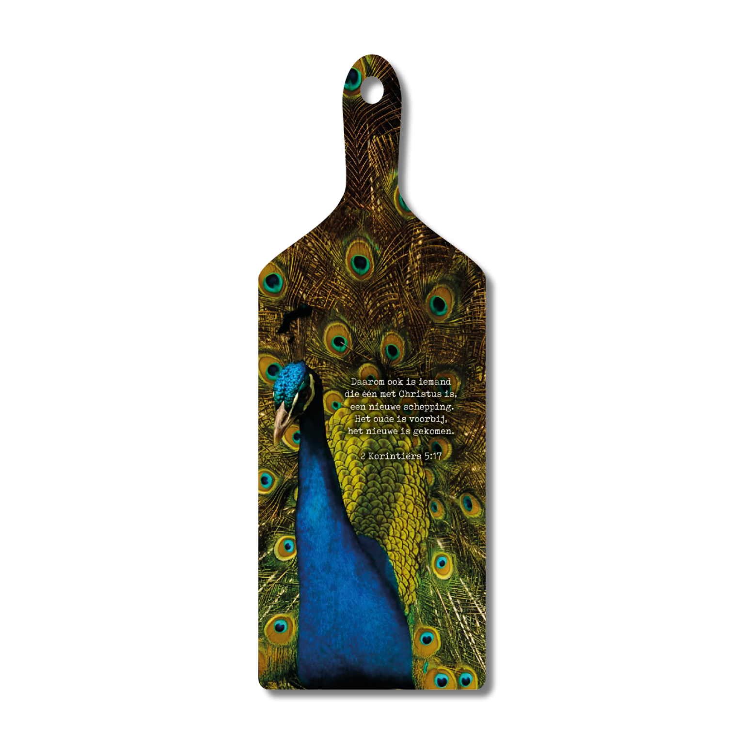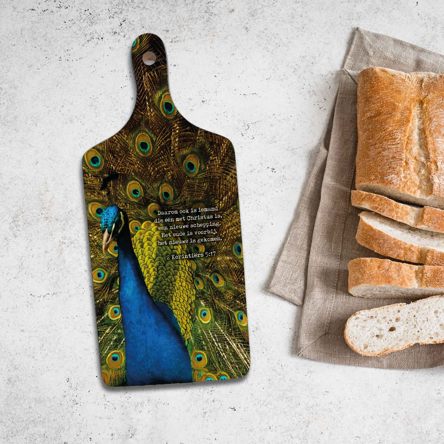 Op deze broodplank staat de bijbeltekst 2 Korintiërs 5:17: ‘Daarom ook is iemand die één met Christus is, een nieuwe schepping. Het oude is voorbij, het nieuwe is gekomen.’