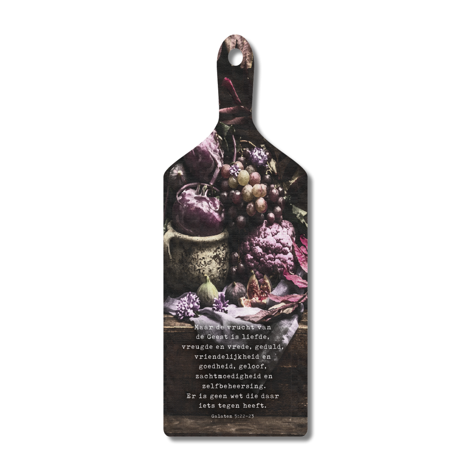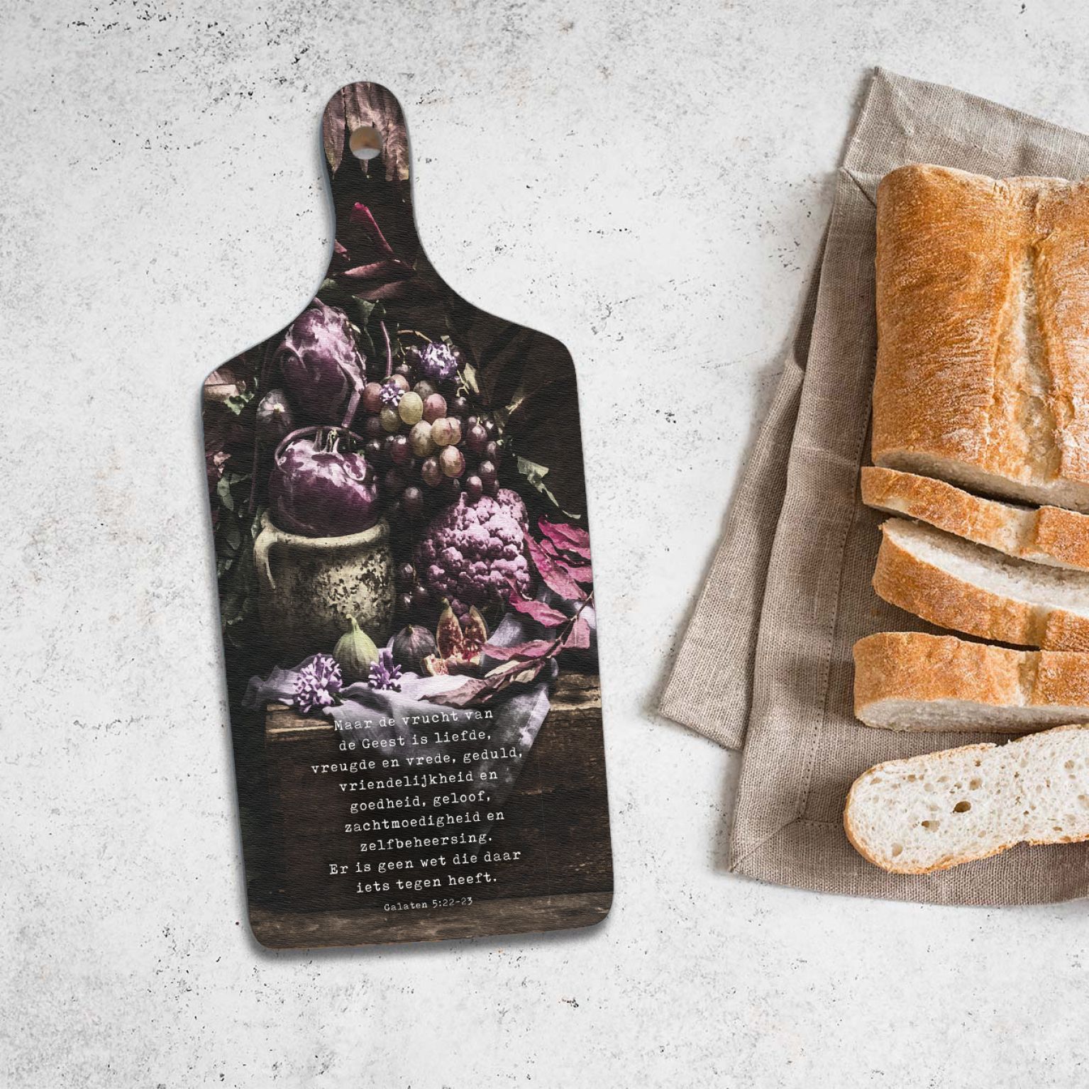 Op deze broodplank staat de bijbeltekst Galaten 5:22-23: ‘Maar de vrucht van de Geest is liefde, vreugde en vrede, geduld, vriendelijkheid en goedheid, geloof, zachtmoedigheid en zelfbeheersing. Er is geen wet die daar iets tegen heeft.’