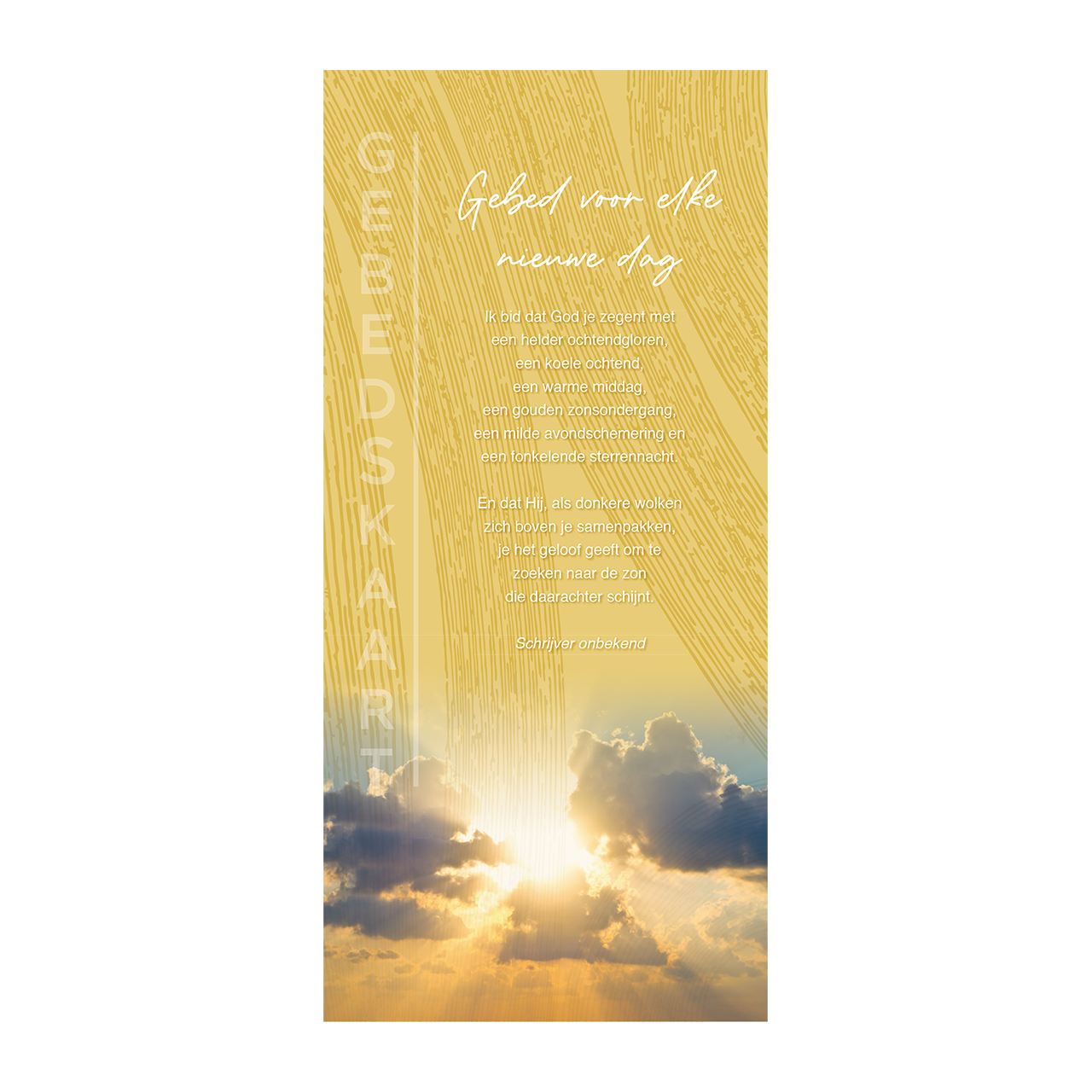 Deze gebedskaart bevat een inspirerend gebed, perfect om iemand toe te wensen of zelf te bidden. Het herinnert eraan altijd hoop te houden en het licht te blijven zien, zelfs achter de donkere wolken. Een waardevolle boodschap van kracht en vertrouwen.