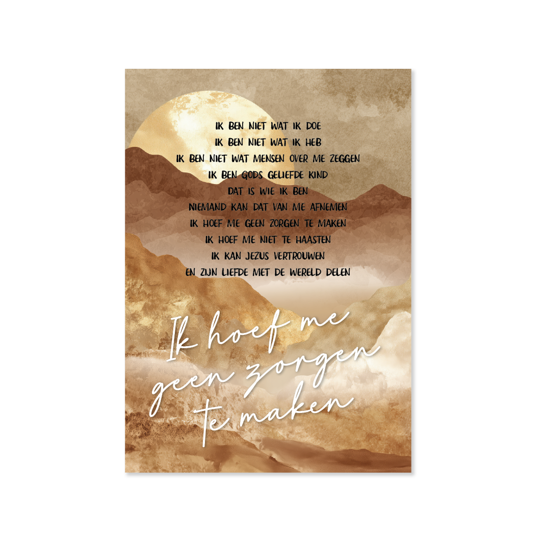 Sfeervol A3-bord met de bemoedigende tekst: Ik hoef me geen zorgen te maken. Deze tekst is het credo van Hour of Power. De warme bruine tint, met op de achtergrond bergen en een gouden zon, straalt rust, vertrouwen en hoop uit. Stijlvolle christelijke wanddecoratie voor thuis, kerk of kantoor.