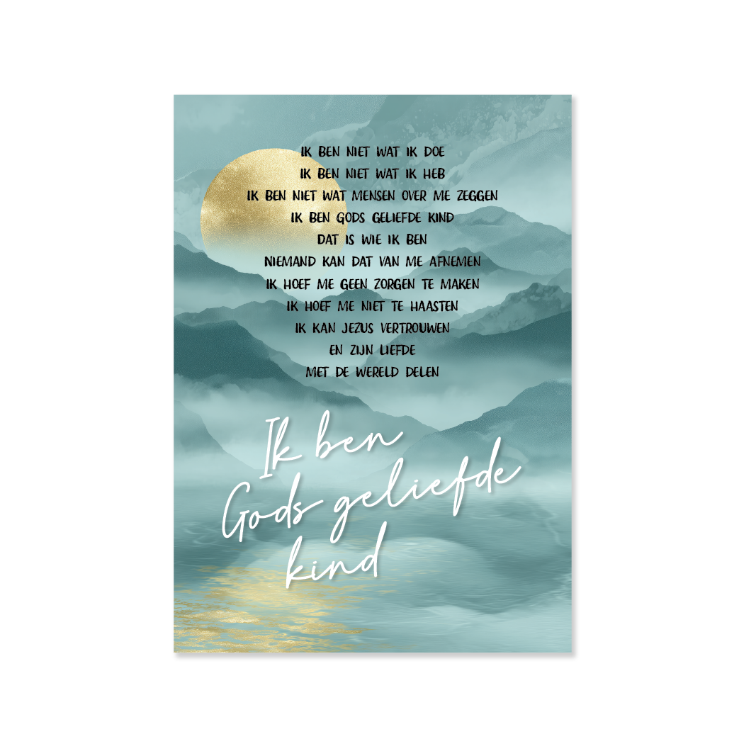 Inspirerend bord in plexiglas in A4- en A5-formaat met het credo van Hour of Power: Gods geliefde kind. De afbeelding toont bergen in petrolkleuren met een subtiel goudaccent. Dit stijlvolle bord is een blijvende christelijke wanddecoratie voor thuis, kerk of kantoor. Het hoogwaardige plexiglas zorgt ervoor dat het licht de kleuren en gouden details prachtig tot leven brengt.