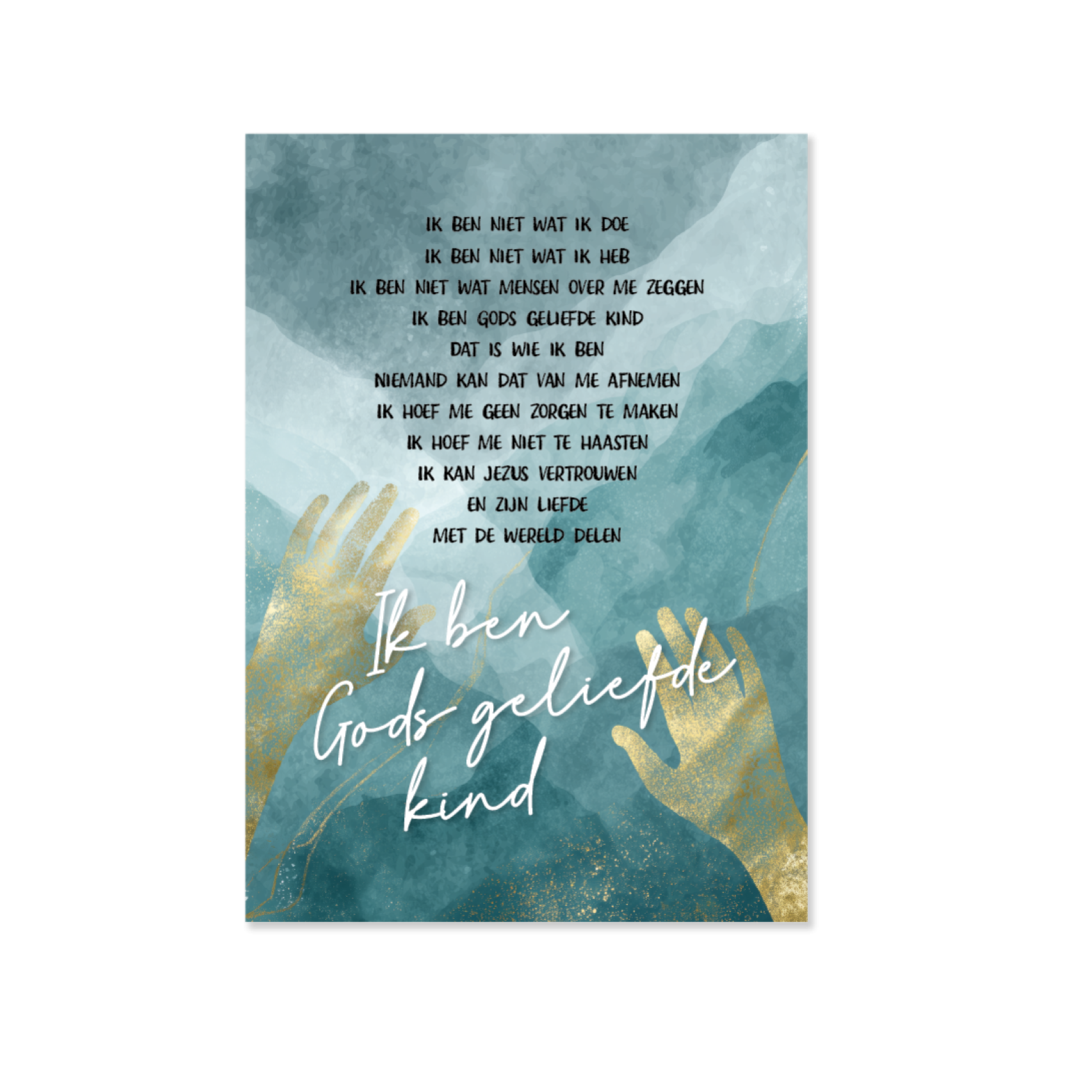 Stijlvol plexiglas wandbord in diepe petrolkleuren met twee gouden handen en de tekst Ik ben Gods geliefde kind. De combinatie van kleur en goudaccenten geeft een warme, beschermende uitstraling. Door het plexiglas krijgen de kleuren extra diepte en helderheid.