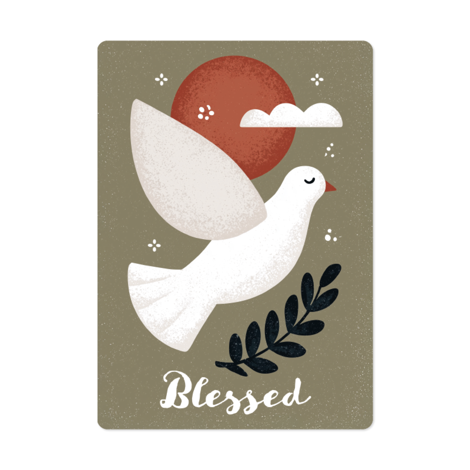 Deze kaart komt uit de Eigenwijs-molen en toont op de voorkant een duif met een olijftakje en de tekst Blessed, zodat je weet dat je gezegend bent.