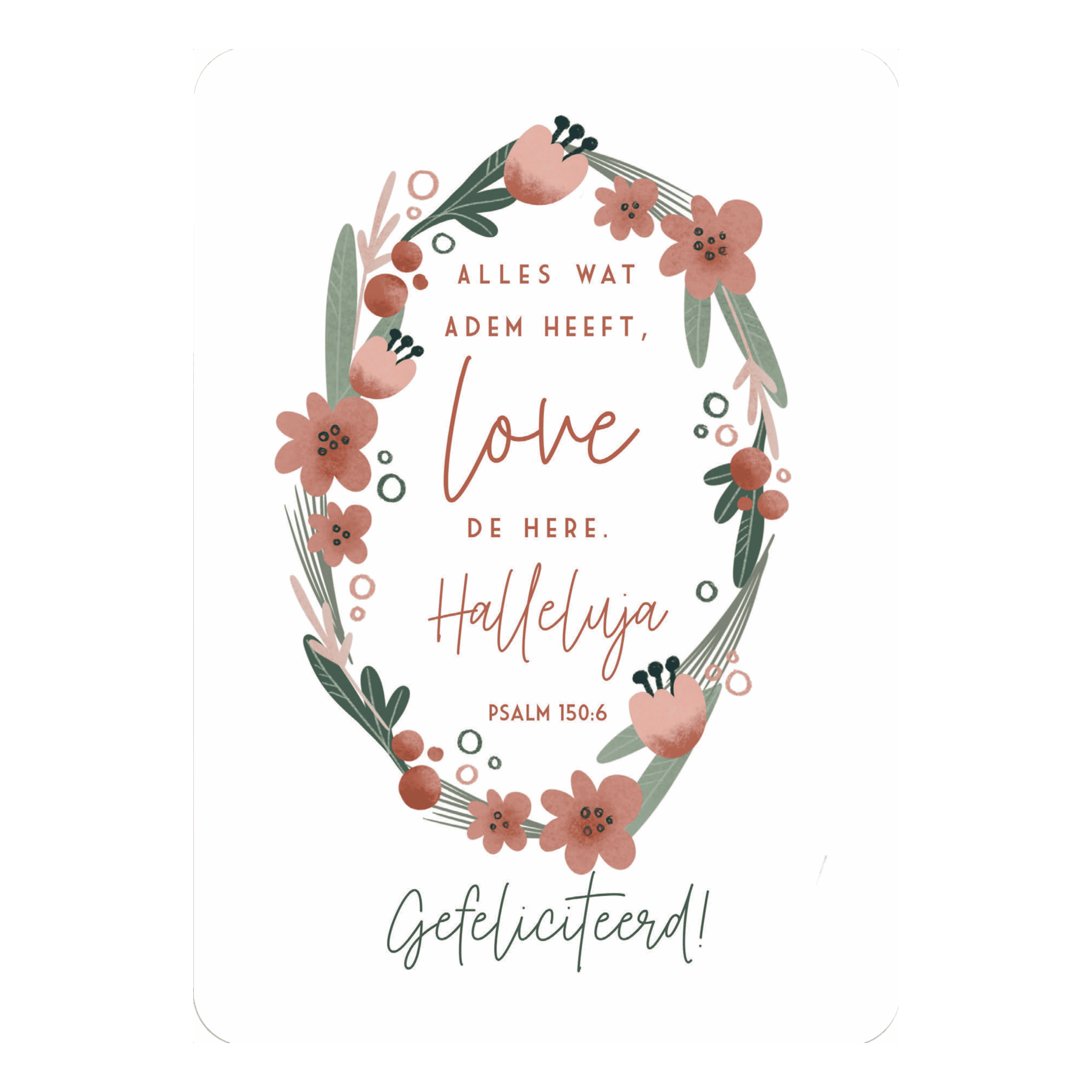 Tekst: ‘Alles wat adem heeft love de Here, halleluja. Psalm 150:6. Gefeliciteerd’