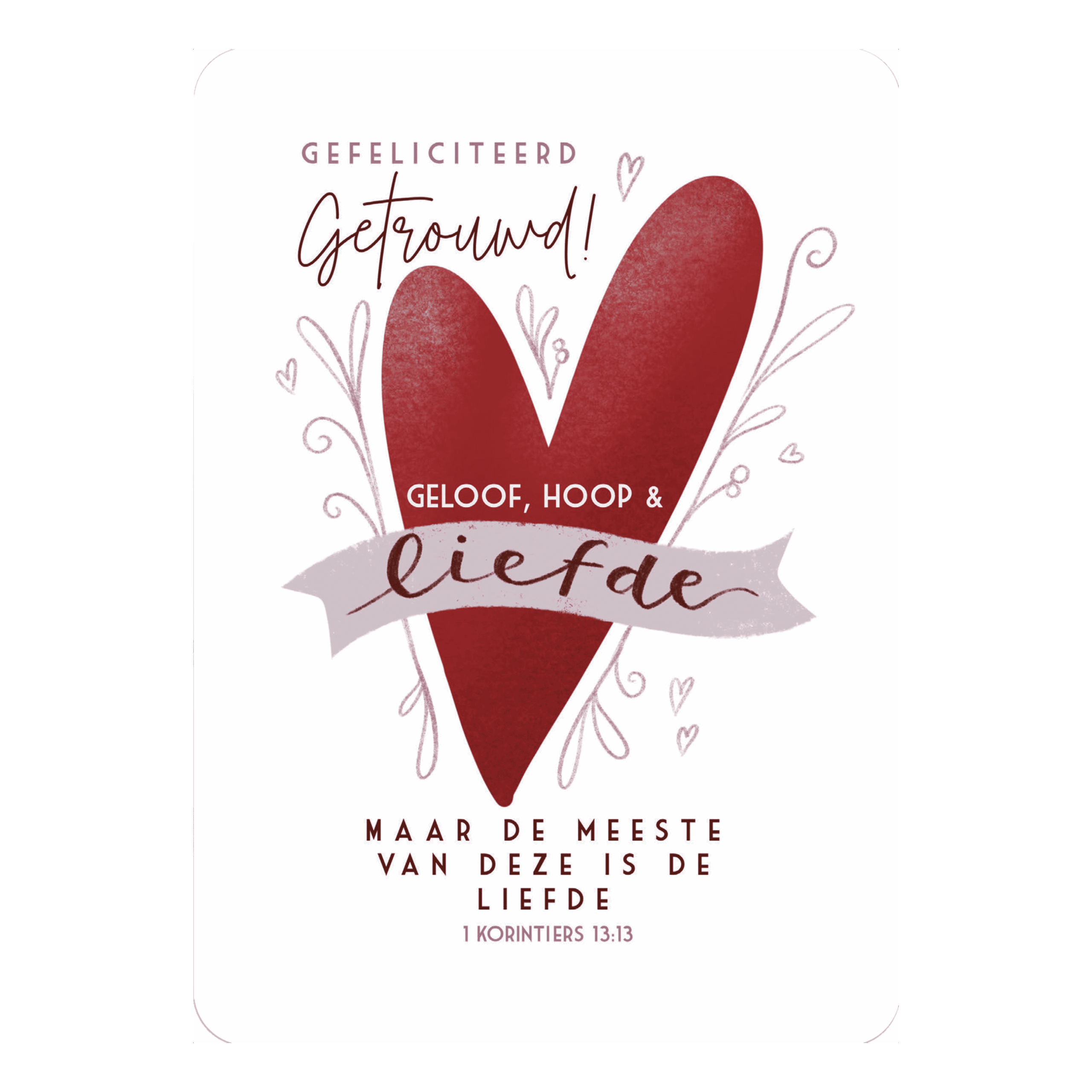 Tekst: ‘Gefeliciteerd getrouwd! Geloof, hoop & liefde. Maar de meeste van deze is de liefde. 1 Korintiërs 13:13’