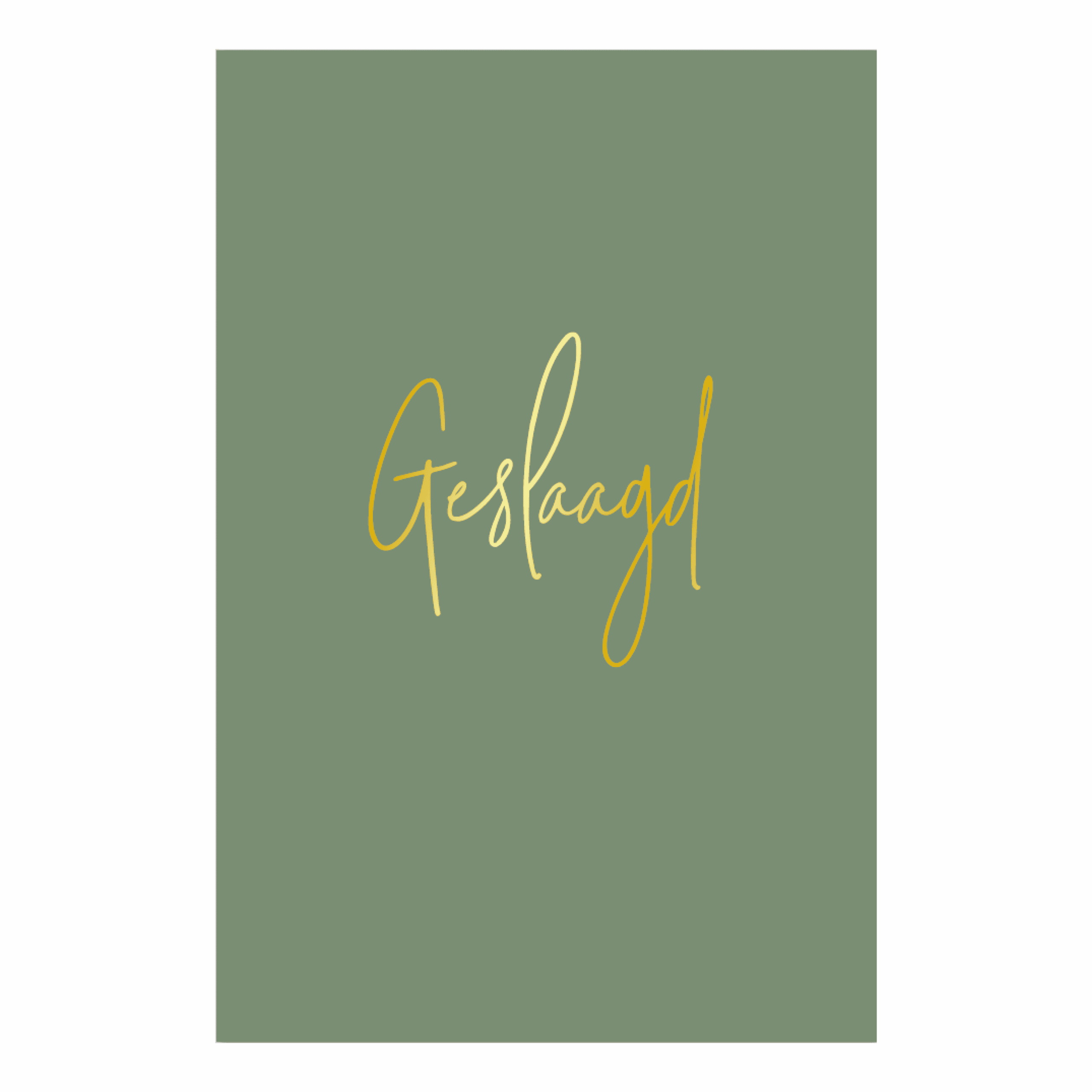Luxe kaart uit de serie ‘Schrijven is Goud’, bedrukt met prachtig goudfolie. Tekst: ‘Geslaagd’