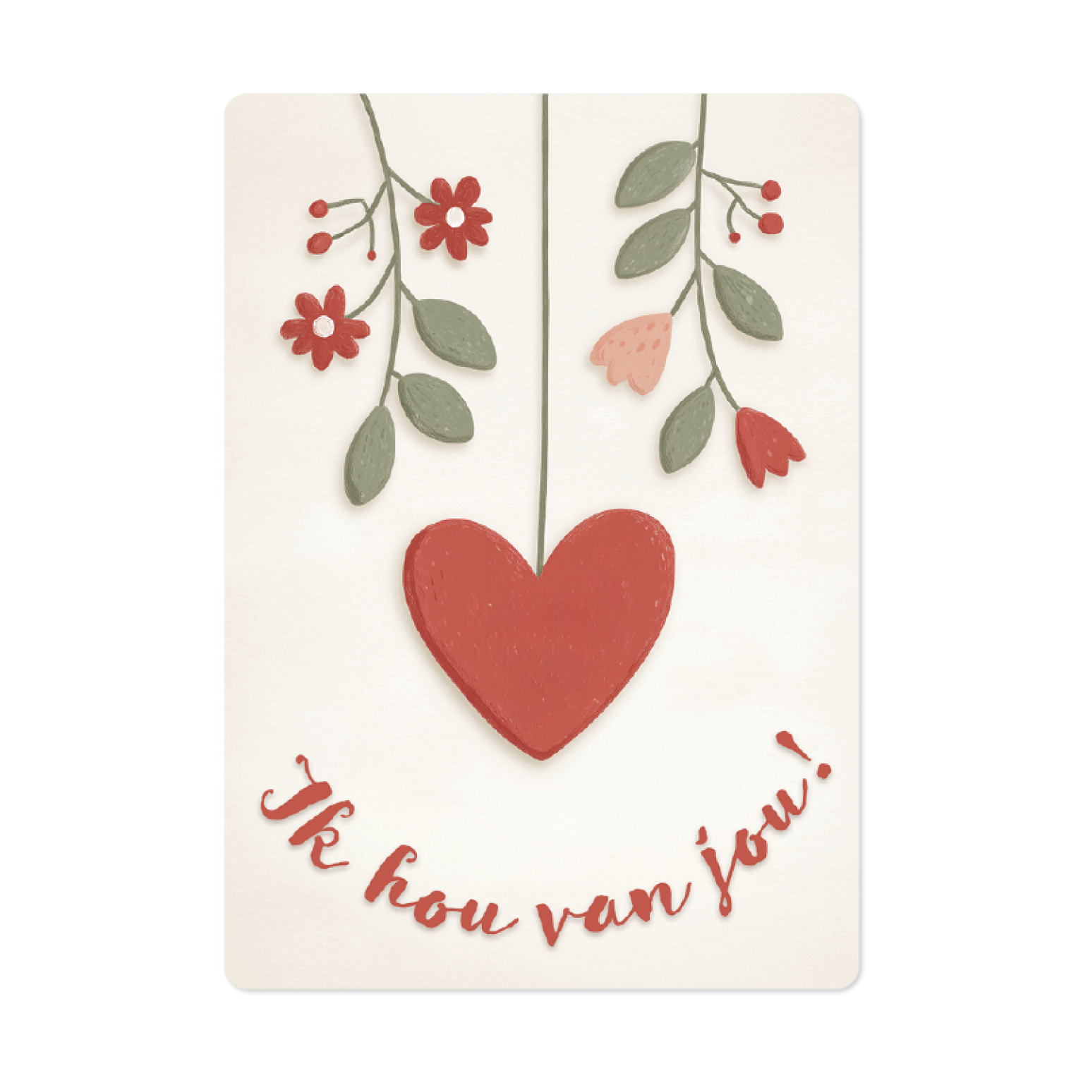 Deze kaart komt uit de Eigenwijs-molen en toont op de voorkant een hart met de tekst Ik hou van jou. Een eenvoudige, liefdevolle kaart om iemand te laten weten dat je aan hem of haar denkt.