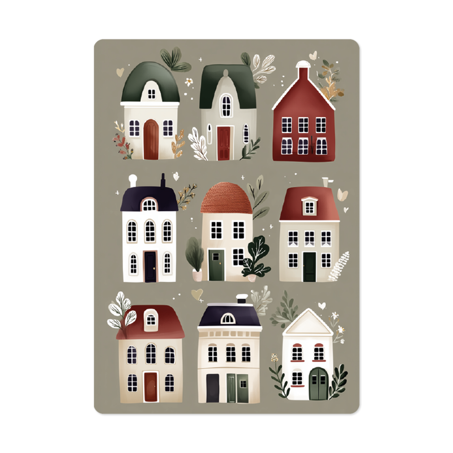 Deze kaart komt uit de Eigenwijs-molen en toont op de voorkant negen huisjes. Op de achterkant staat de schriftverwijzing Jozua 24:15b. ‘Ikzelf en mijn familie zullen de HEER dienen.’
