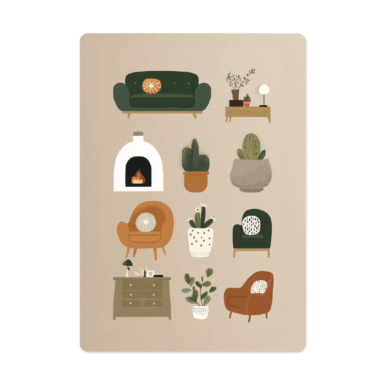 Deze kaart komt uit de Eigenwijs-molen en toont op de voorkant een huiskamer met meubels en plantjes. Op de achterkant staat de schriftverwijzing Psalm 23:6: ‘Geluk en genade volgen mij