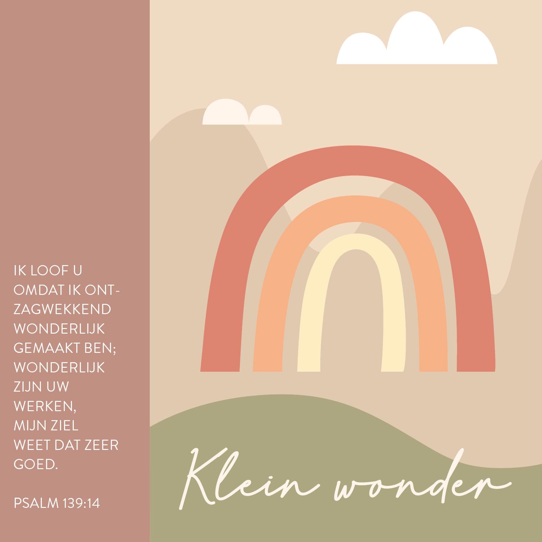 Christelijke enkele kaart van ca. 15 x 15 cm met de tekst: ‘Ik loof U omdat ik ontzagwekkend wonderlijk gemaakt ben; wonderlijk zijn Uw werken, mijn ziel weet dat zeer goed.’ De kaart kan aan de blanco achterzijde beschreven worden. Wordt geleverd met envelop. Artikelnummer: MA56030