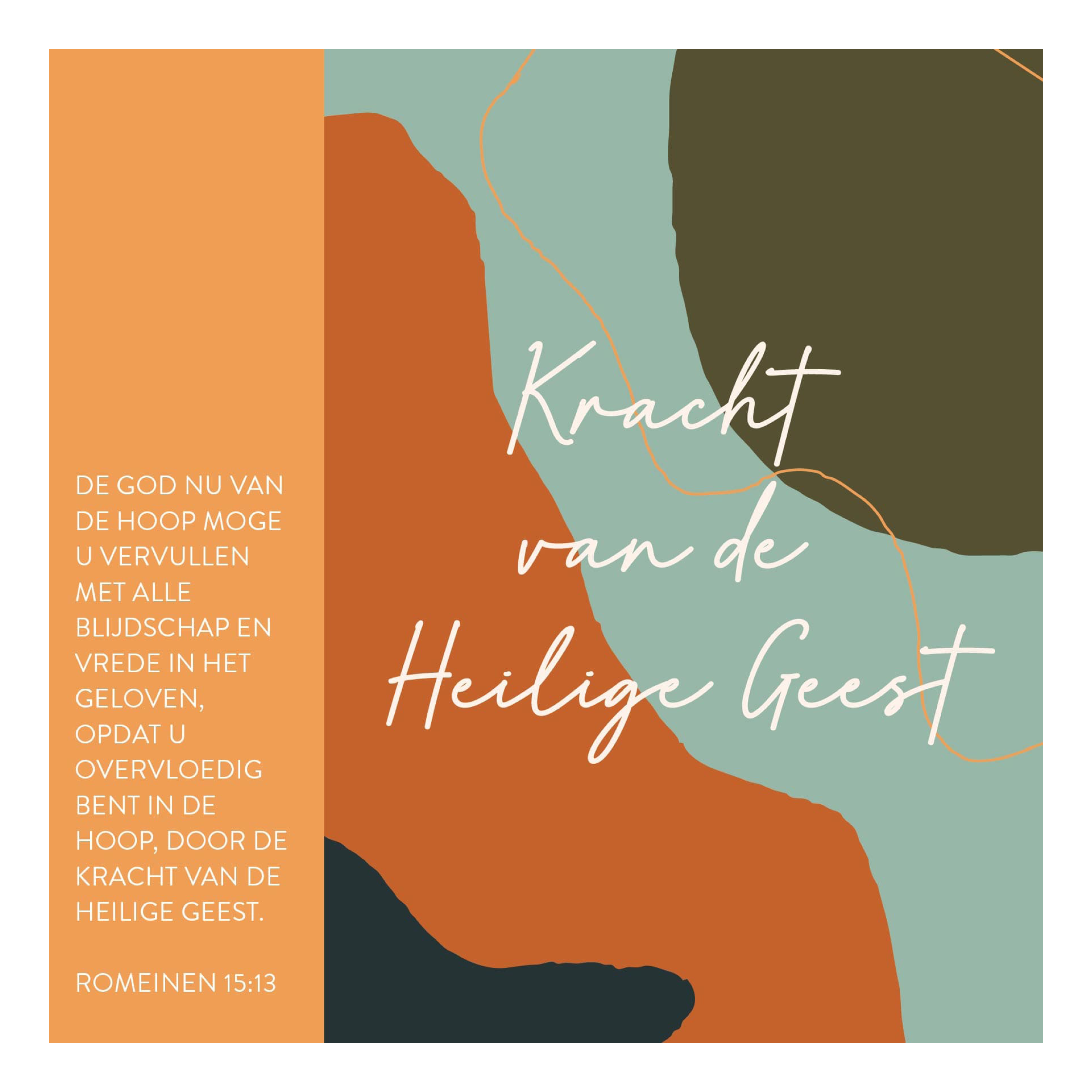 Christelijke enkele kaart van ca. 15 x 15 cm met de tekst: ‘De God nu van de hoop moge u vervullen met alle blijdschap en vrede in het geloven, opdat u overvloedig bent in de hoop, door de kracht van de Heilige Geest.‘ De kaart kan aan de blanco achterzijde beschreven worden. Wordt geleverd met envelop. Artikelnummer: MA56019