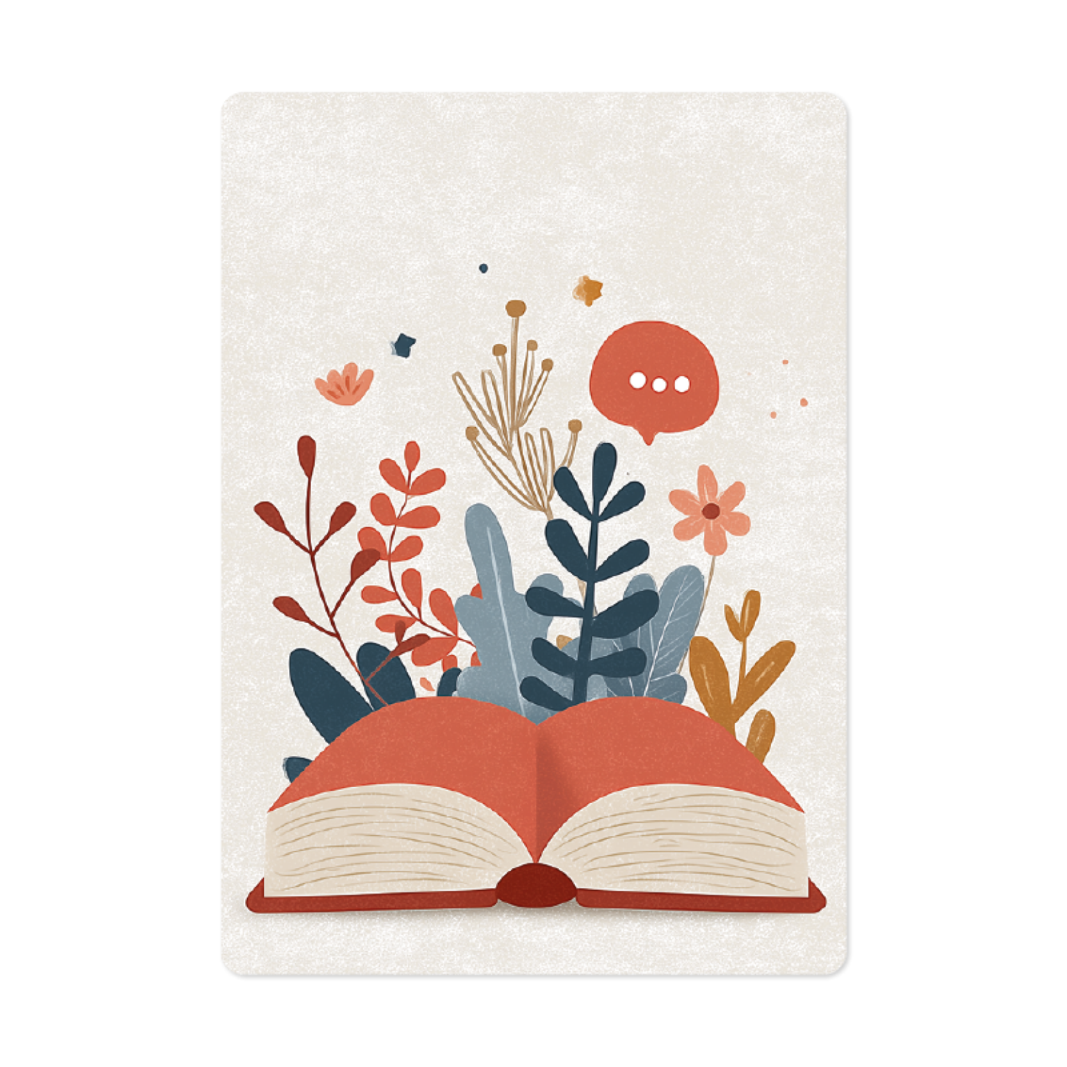 Deze kaart komt uit de Eigenwijs-molen en toont op de voorkant een opengeslagen boek met bloemen erachter. Op de achterkant staat de schriftverwijzing Psalm 32:8: ‘Ik geef inzicht en wijs de weg die je moet gaan.