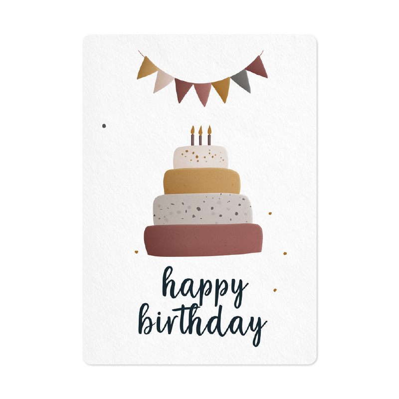 Deze kaart komt uit de Eigenwijs-molen en toont op de voorkant een verjaardagstaart met slingers en de tekst Happy Birthday. Een vrolijke kaart om iemand te feliciteren met zijn of haar verjaardag.