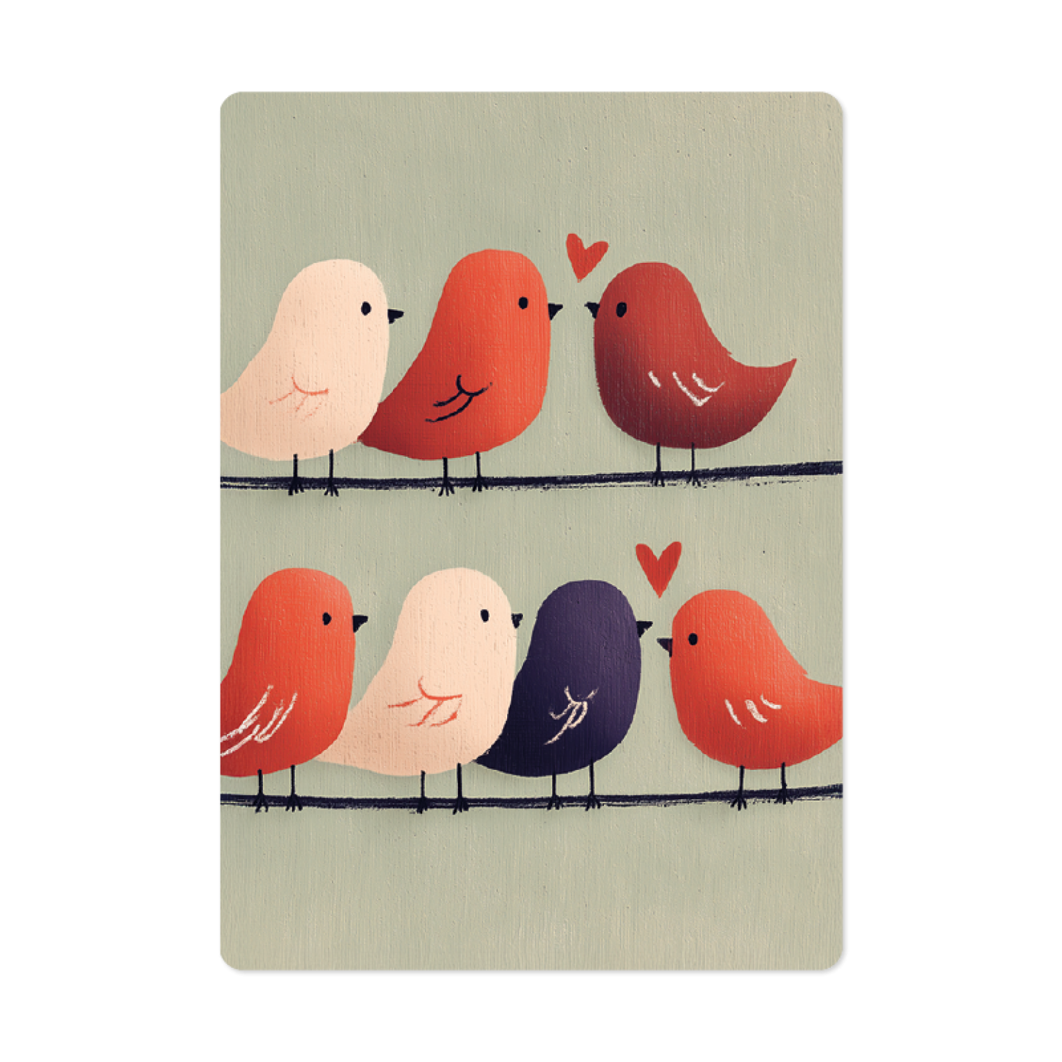 Deze kaart komt uit de Eigenwijs-molen en toont op de voorkant twee lijnen met vogeltjes. Op de achterkant staat de tekstverwijzing Matteüs 6:26: ‘Kijk naar de vogels in de lucht: ze zaaien niet en oogsten niet en vullen geen voorraadschuren; het is jullie hemelse Vader die ze voedt. Zijn jullie niet meer waard dan zij?’