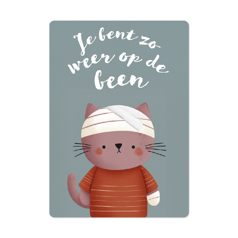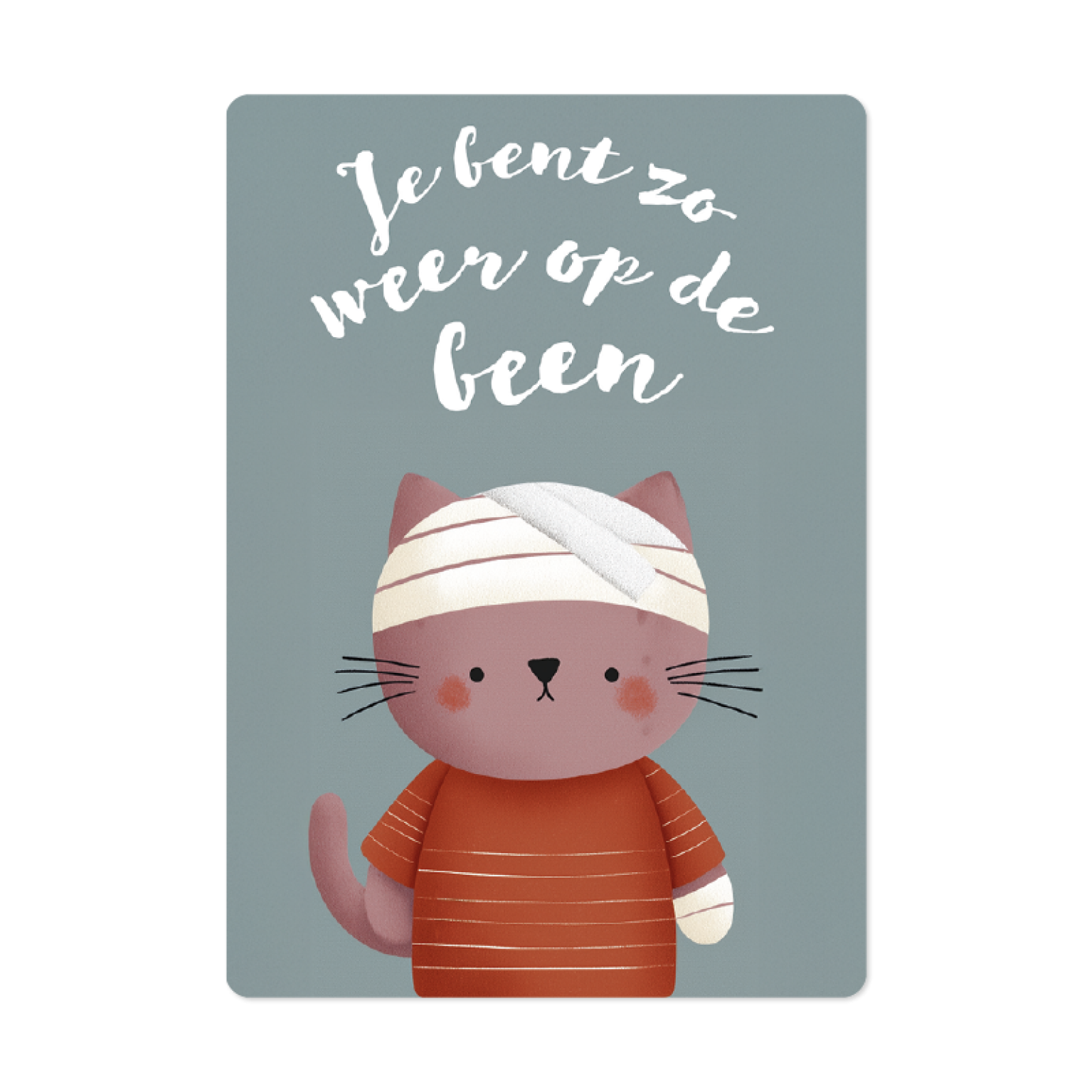 Deze kaart komt uit de Eigenwijs-molen en toont op de voorkant een katje met verband om het hoofd en pootje, met de tekst Je bent zo weer op de been. Een lieve, opbeurende kaart om iemand beterschap te wensen.