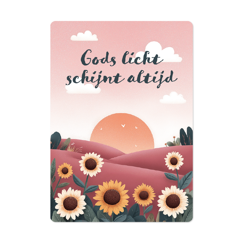 Deze kaart komt uit de Eigenwijs-molen en toont op de voorkant een zonsondergang met zonnebloemen, met de tekst Gods licht schijnt altijd. Een warme, hoopvolle kaart die herinnert aan licht en vertrouwen, in elk seizoen.