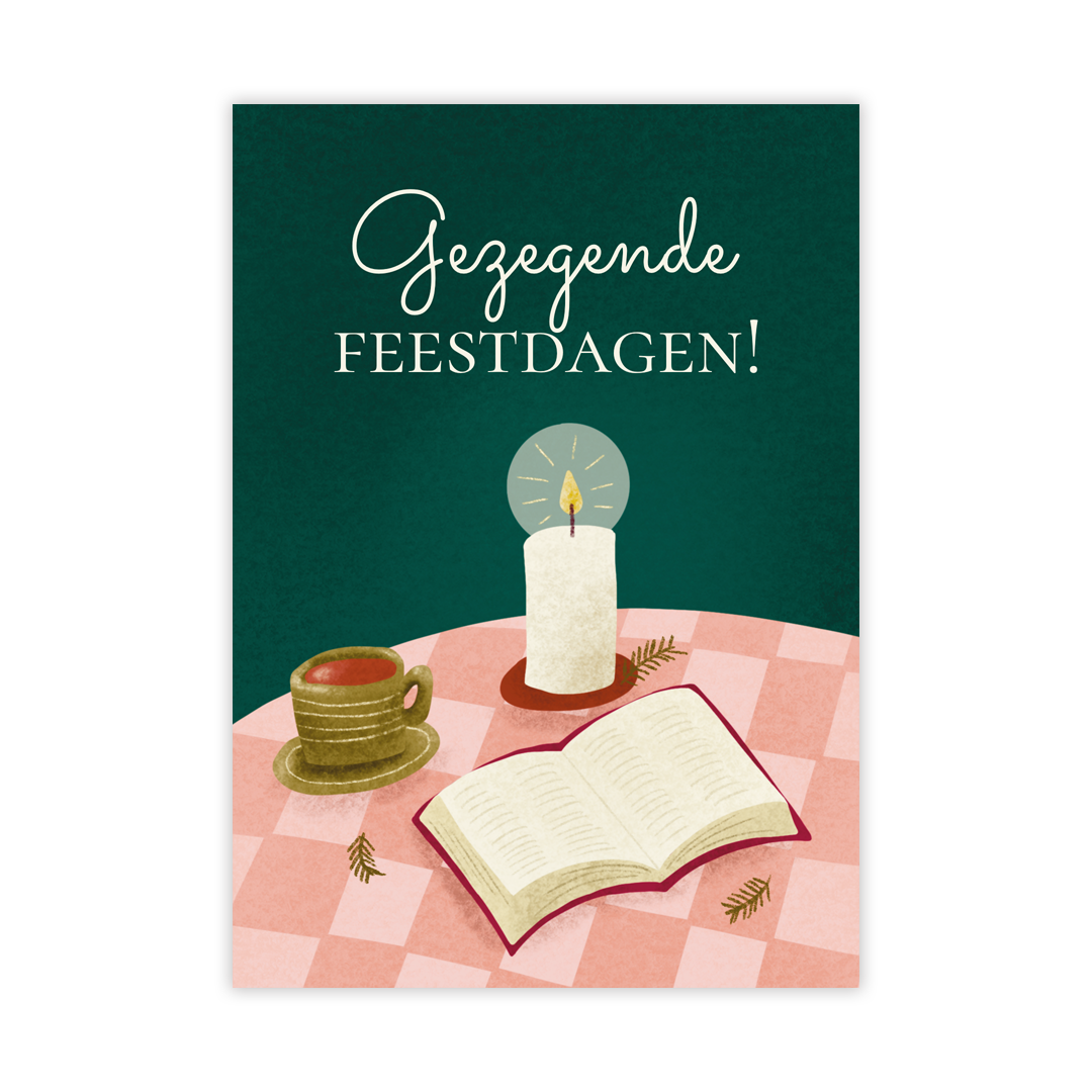 Een warme tafereel: een geopende Bijbel, een brandende kaars en een kopje thee of koffie op een tafel met rood geblokt kleed. De tekst ‘Gezegende feestdagen’ maakt het compleet.