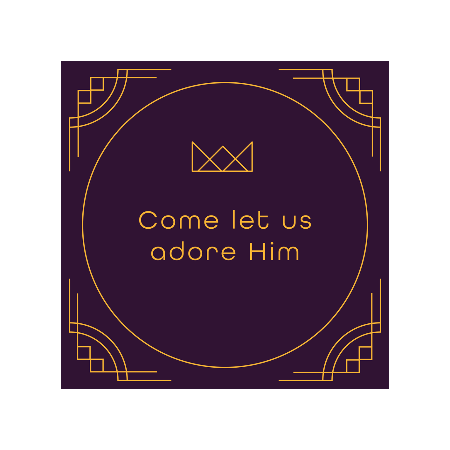 Christelijke kerstkaart met de tekst ‘Come let us adore Him’, bedrukt met goudfolie.