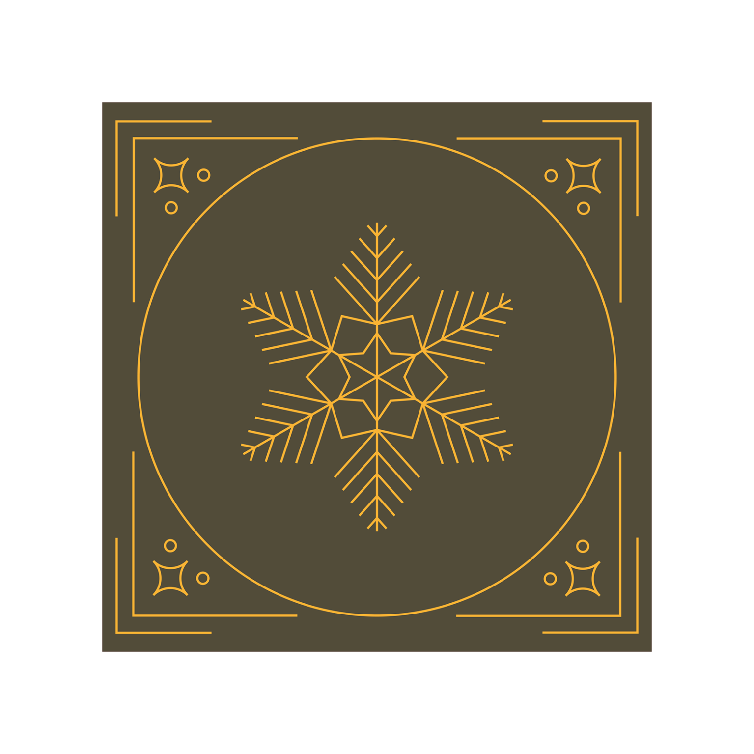 Minimalistische kerstkaart met een elegante gouden sneeuwvlok, bedrukt met goudfolie op een bruine achtergrond.