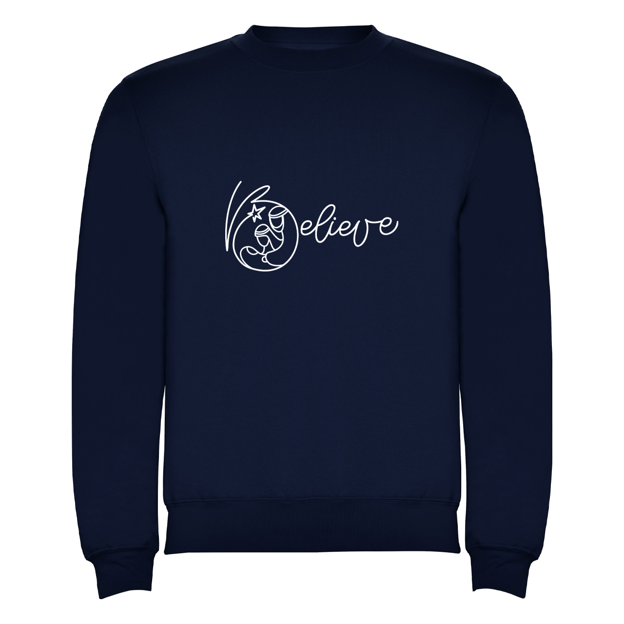Op de voorzijde staat de grote tekst ‘Believe’, vergezeld door een afbeelding van Jozef, Maria, baby Jezus en een ster.