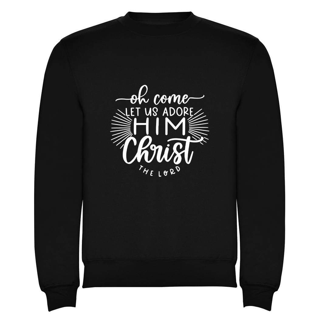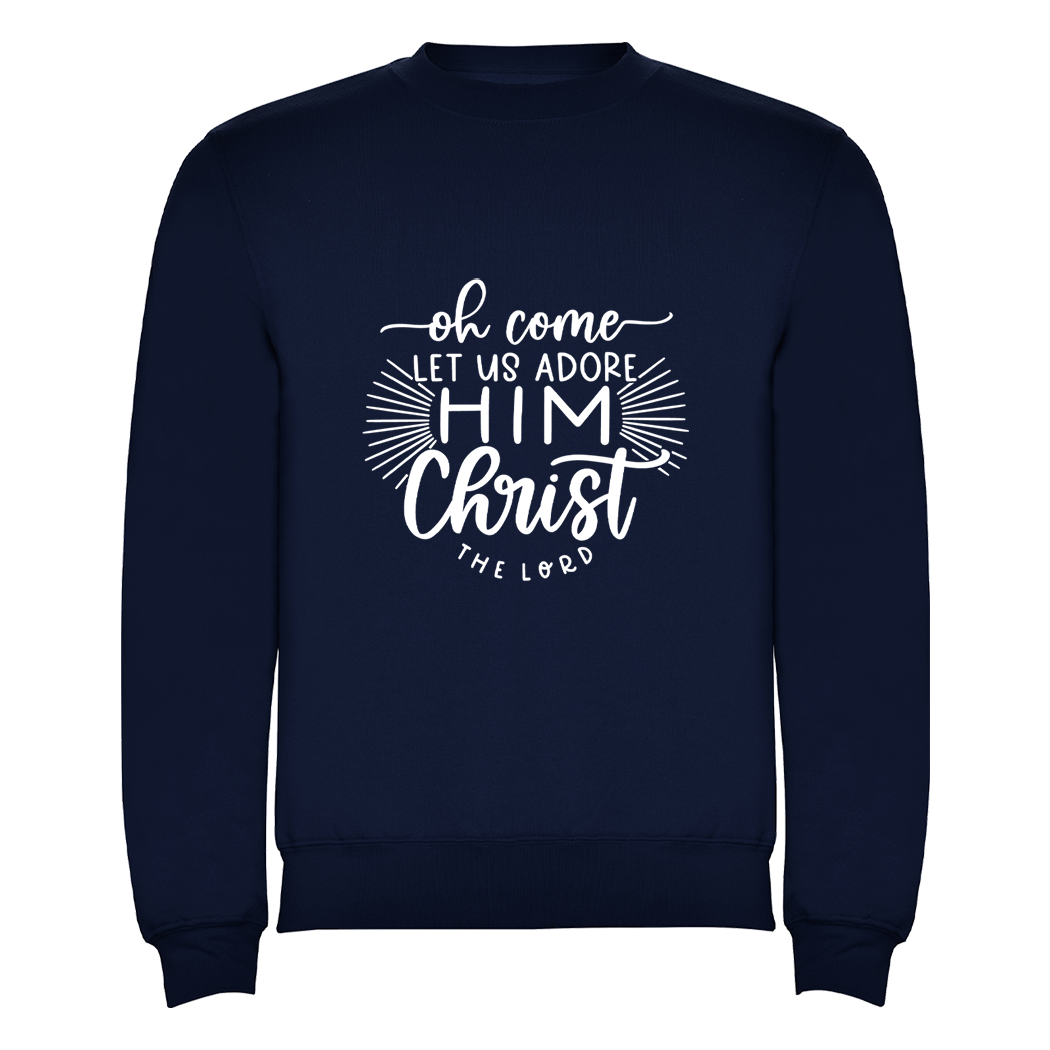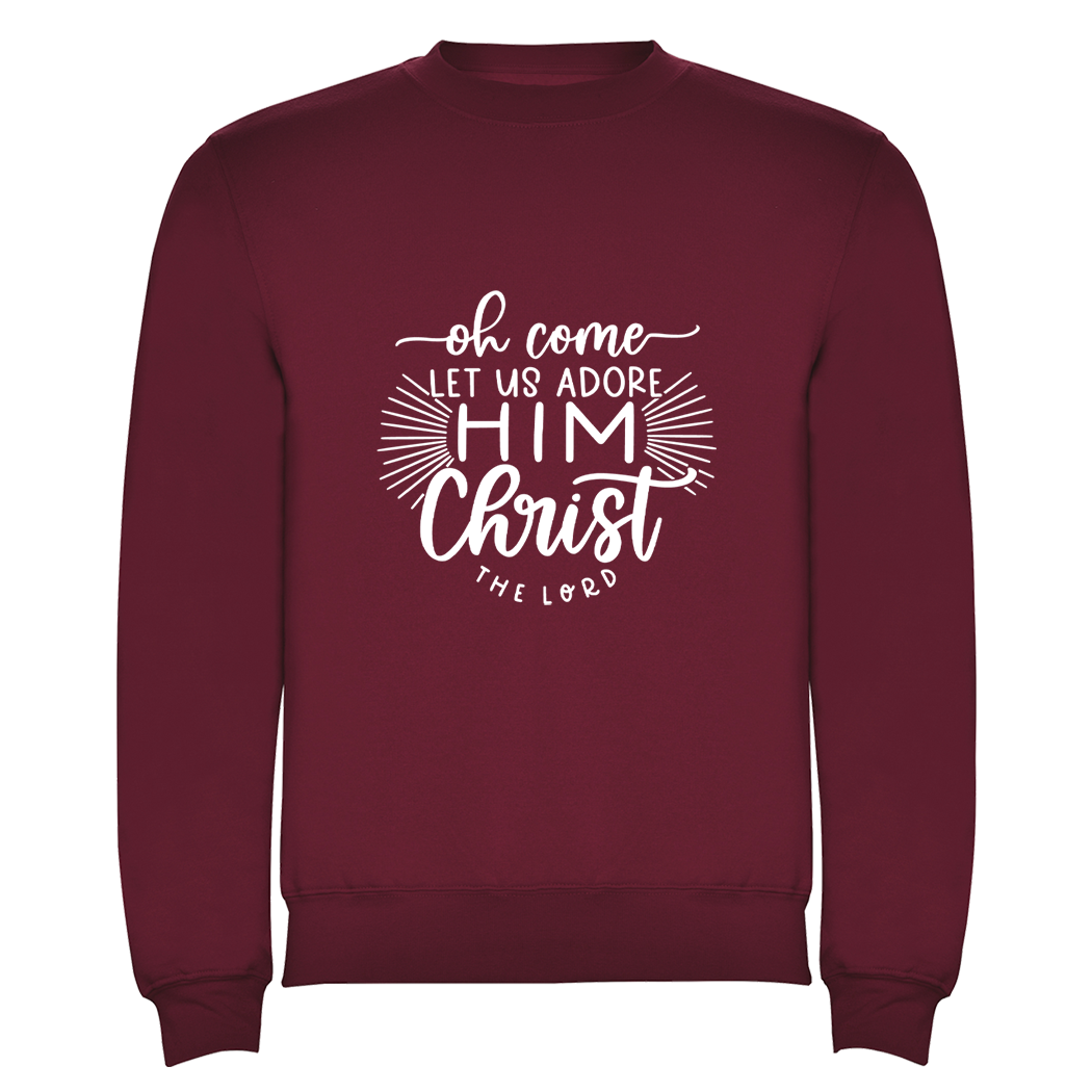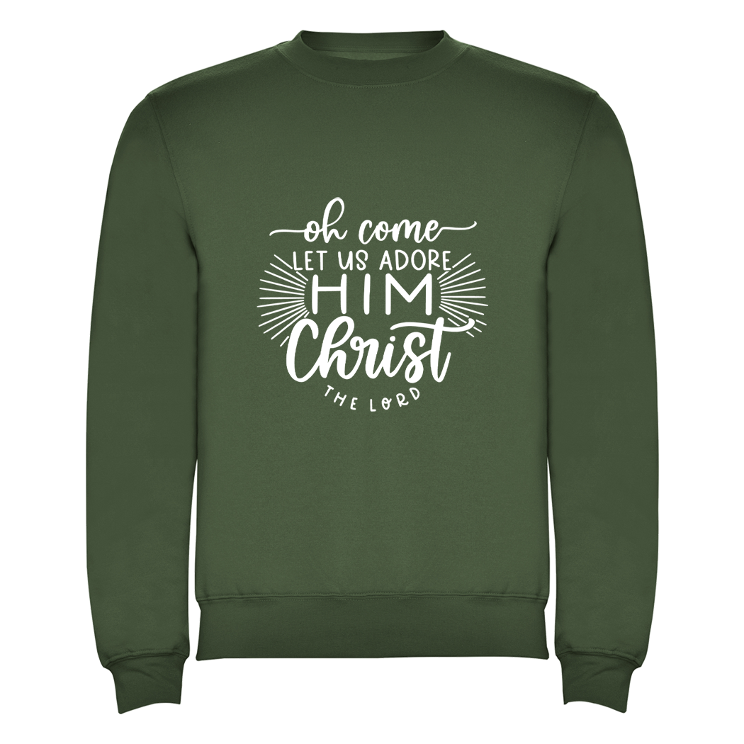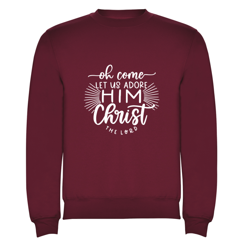 De tekst ‘Oh Come Let Us Adore Him, Christ the Lord’ staat in grote letters op de voorzijde, geïnspireerd door het klassieke kerstlied.