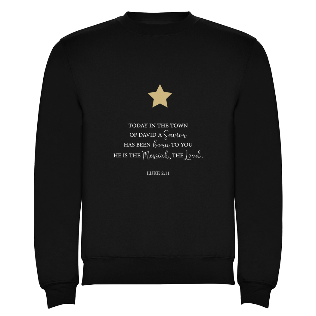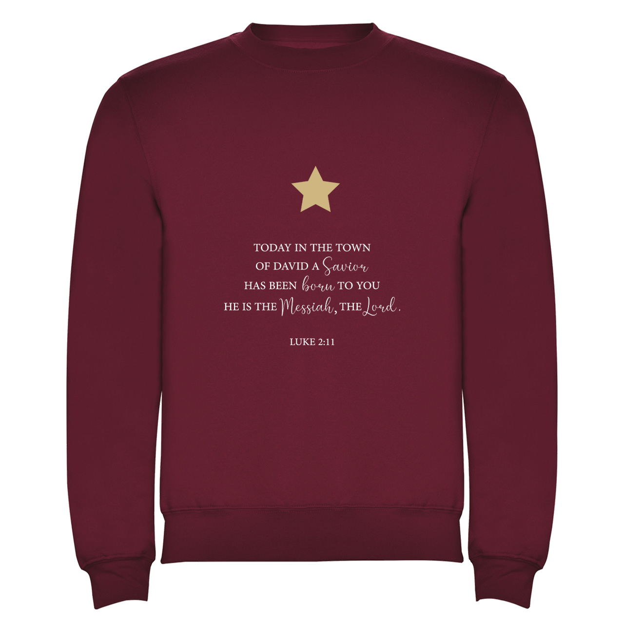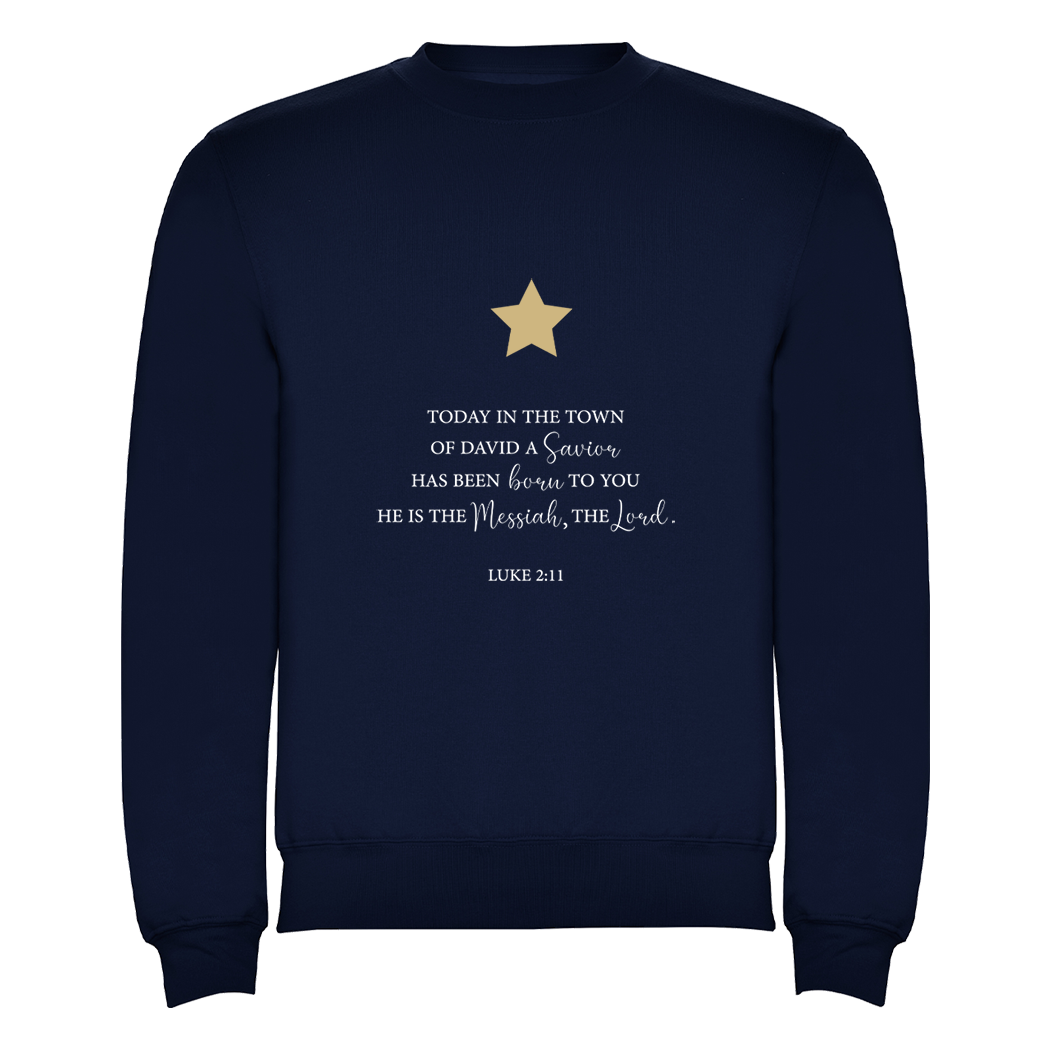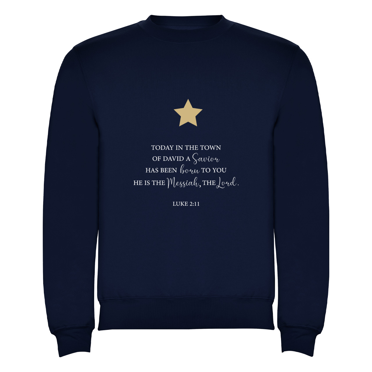 Met een grote print op de voorzijde met de inspirerende tekst uit Lucas 2:11 en een gouden ster straalt deze trui de ware kerstboodschap uit.