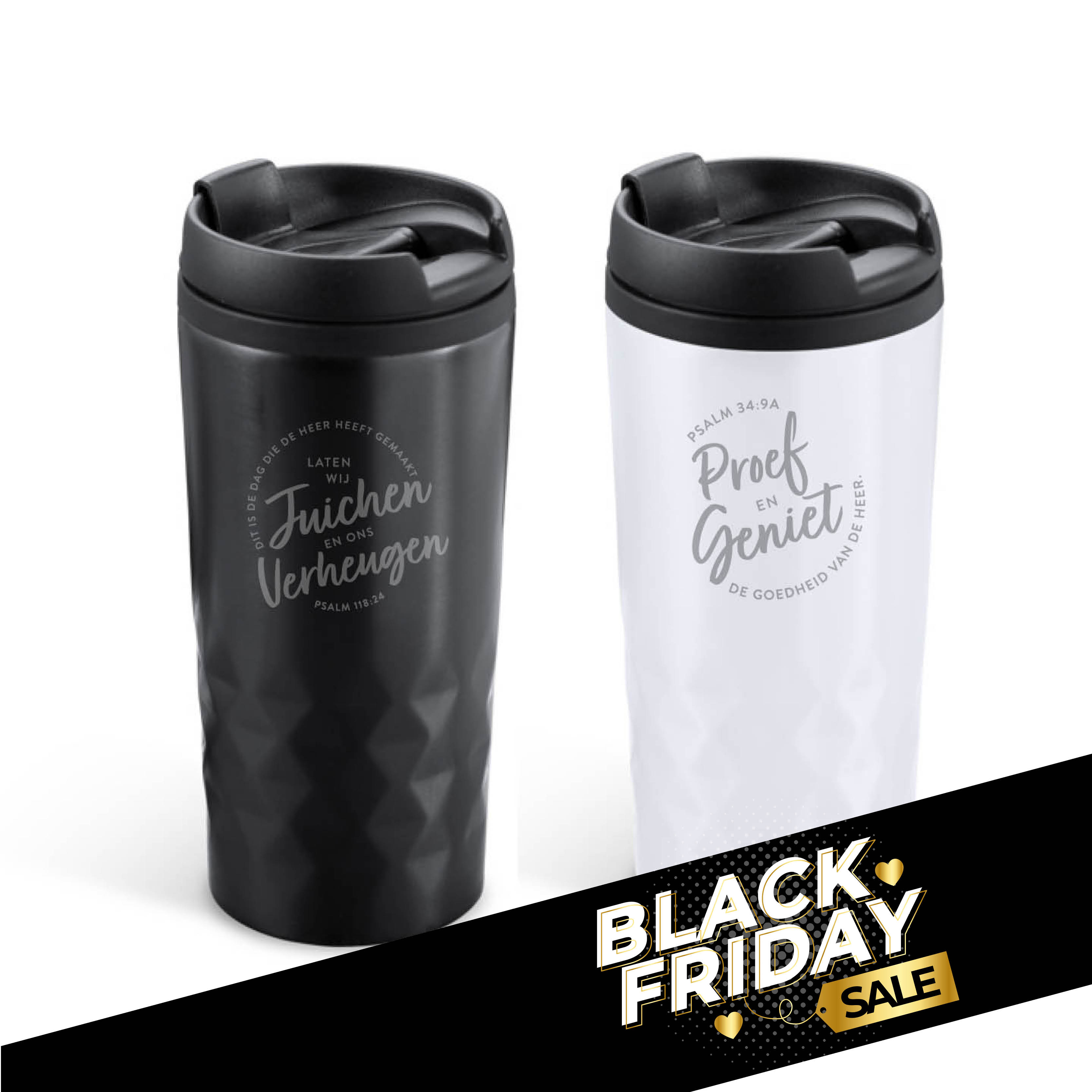 Begin je dag met een warm drankje én een inspirerende boodschap! Deze set bestaat uit een zwarte en witte koffiebeker met de tekst ‘Proef en geniet’ uit Psalm 34:9a en ‘Juichen en verheugen’ uit Psalm 118:24.