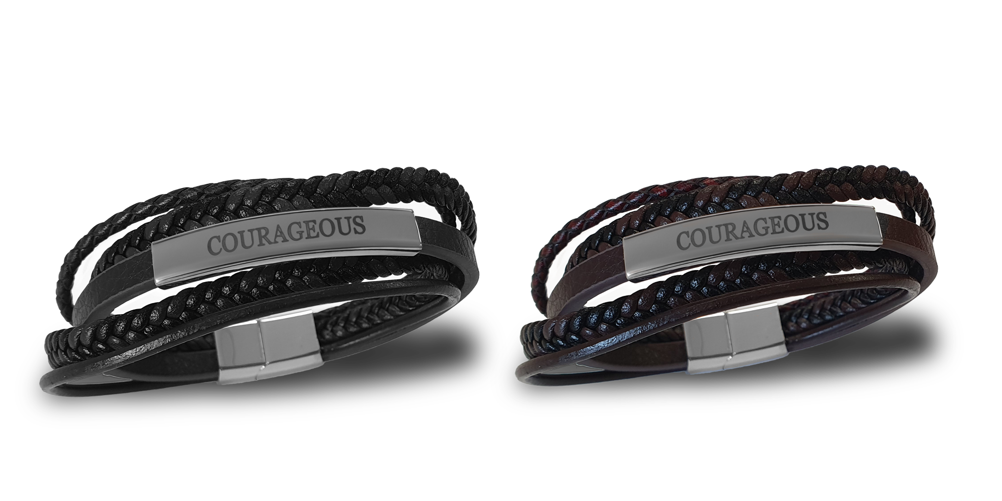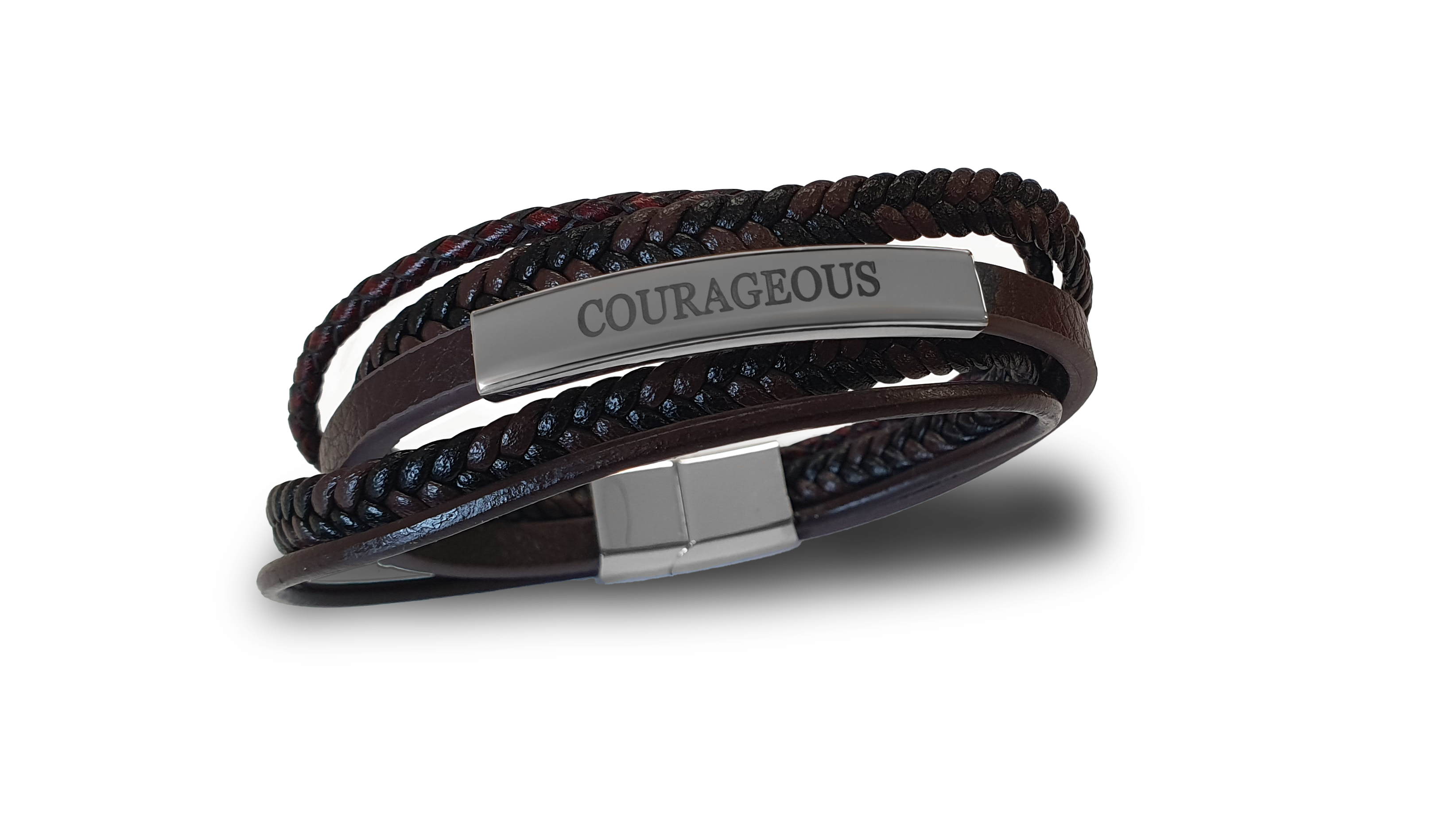 Een stoere, stevige armband van meerdere lagen met het woord ‘Courageous’.