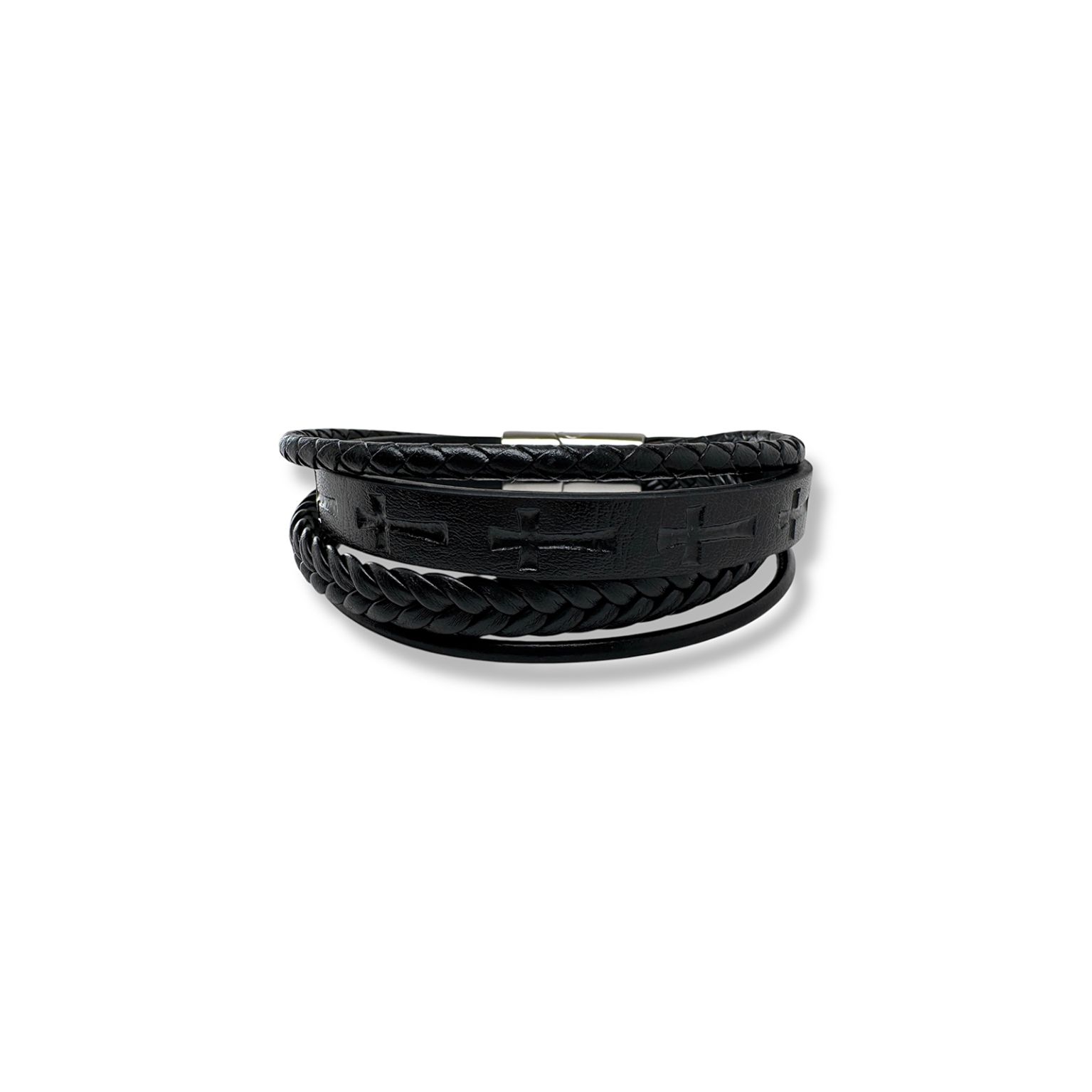 Een stoere leren armband met meerdere lagen en diepdruk kruisjes.