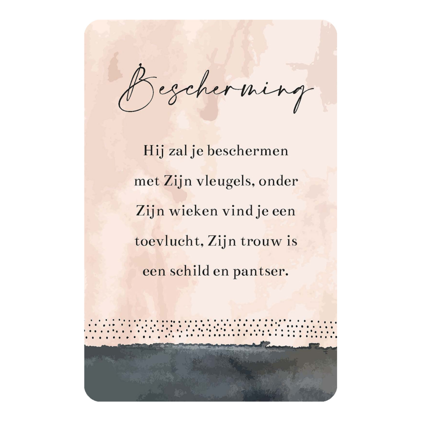 Leuk minikaartje met de tekst ‘Bescherming. Hij zal je beschermen met Zijn vleugels, onder Zijn wieken vind je een toevlucht, Zijn trouw is een schild en pantser’. Perfect om een persoonlijke boodschap toe te voegen aan je cadeau of om een liefdevolle boodschap aan een geliefde te schrijven. De kaarten hebben een blanco achterzijde, zodat deze goed beschreven kan worden.
