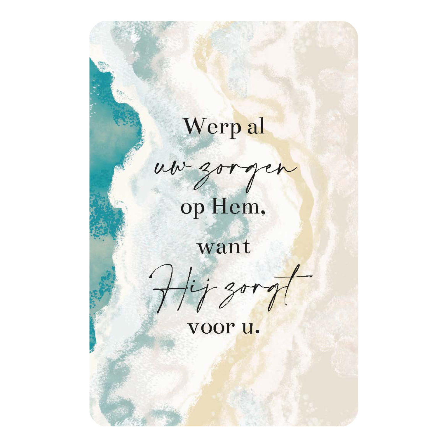 Leuk minikaartje met de tekst ‘Werp al uw zorgen op Hem, want Hij zorgt voor u’. Perfect om een persoonlijke boodschap toe te voegen aan je cadeau of om een liefdevolle boodschap aan een geliefde te schrijven. De kaarten hebben een blanco achterzijde, zodat deze goed beschreven kan worden.