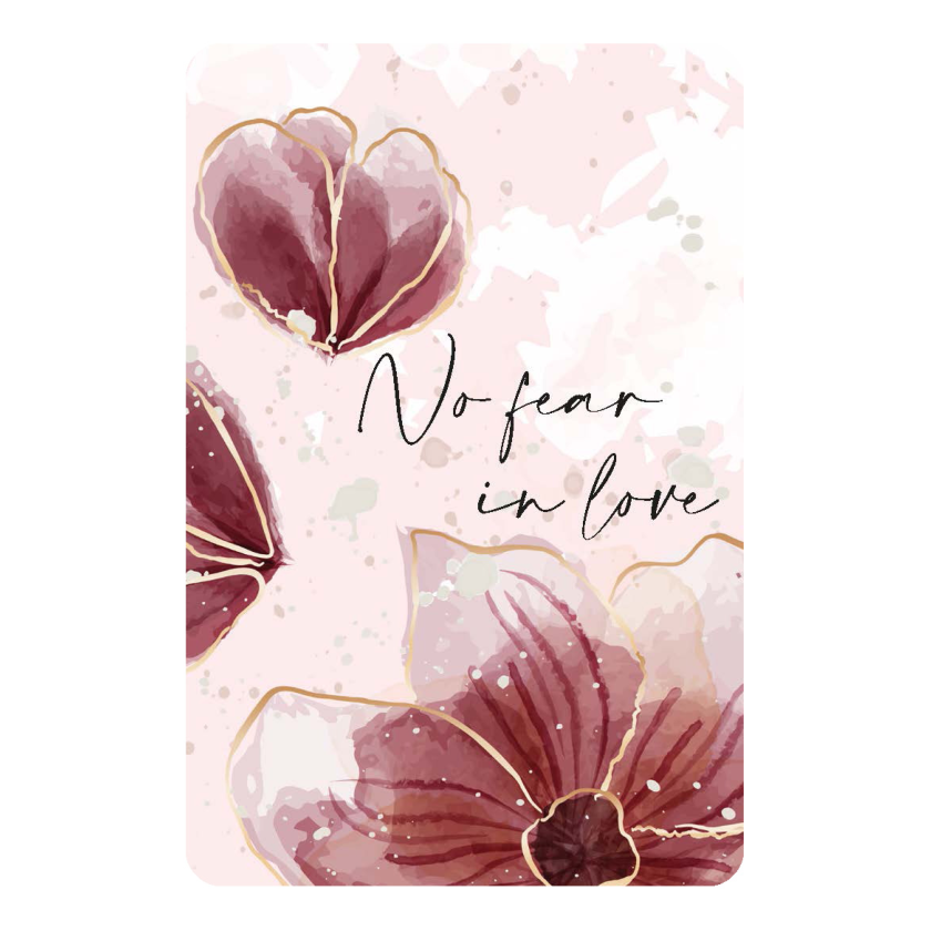 Leuk minikaartje met de tekst ‘No fear in love’. Perfect om een persoonlijke boodschap toe te voegen aan je cadeau, of om een liefdevolle boodschap aan een geliefde te schrijven. De kaarten hebben een blanco achterzijde, zodat deze goed beschreven kan worden.