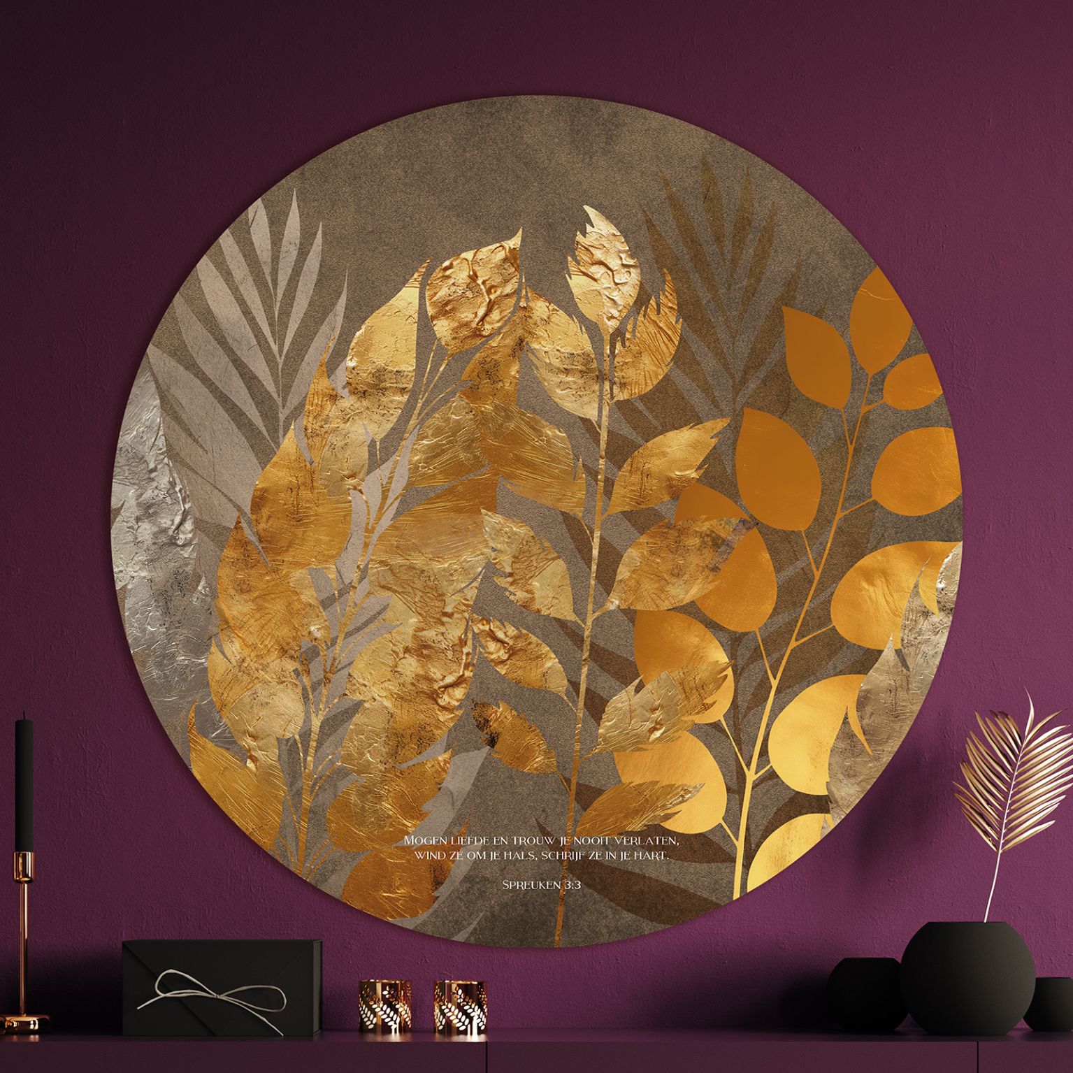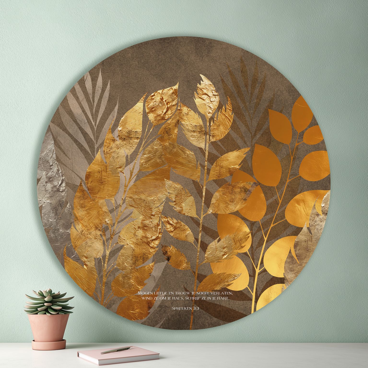 Op deze cirkel staat de bijbeltekst uit Spreuken 3:3: ‘Mogen liefde en trouw je nooit verlaten,wind ze om je hals, schrijf ze in je hart.’