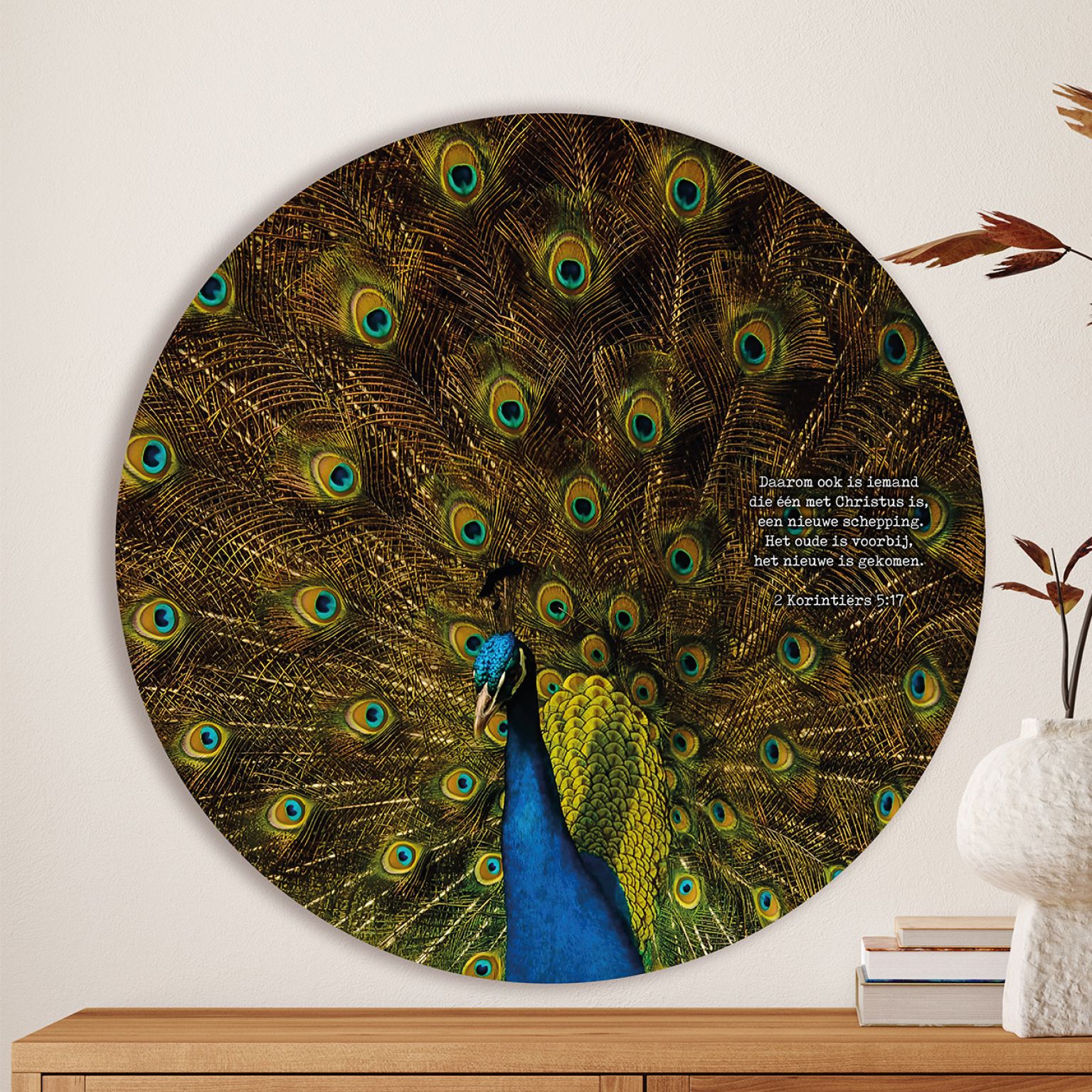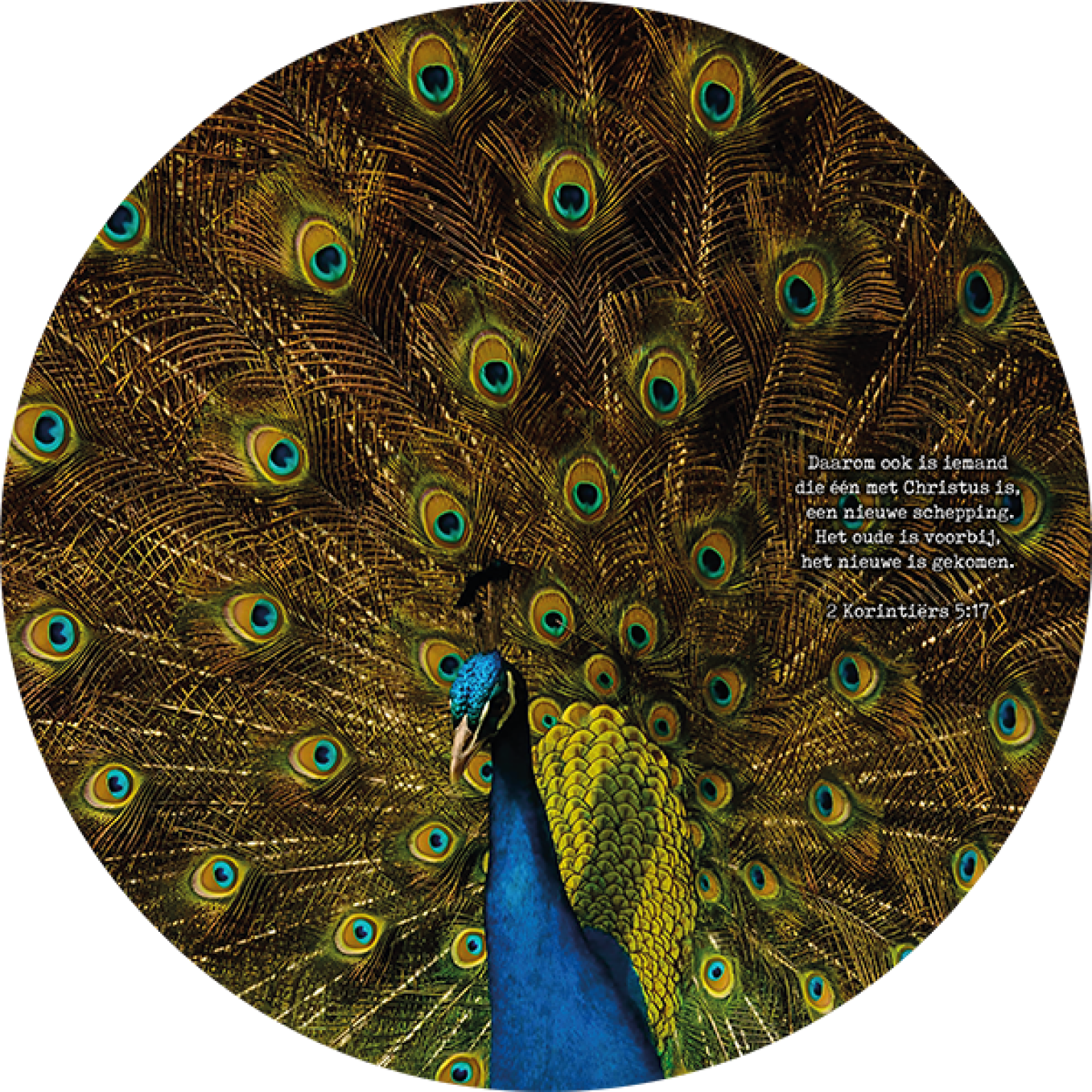 Op deze cirkel staat de bijbeltekst uit 2 Korintiërs 5:17: ‘Daarom ook is iemand die één met Christus is, een nieuwe schepping. Het oude is voorbij, het nieuwe is gekomen.’