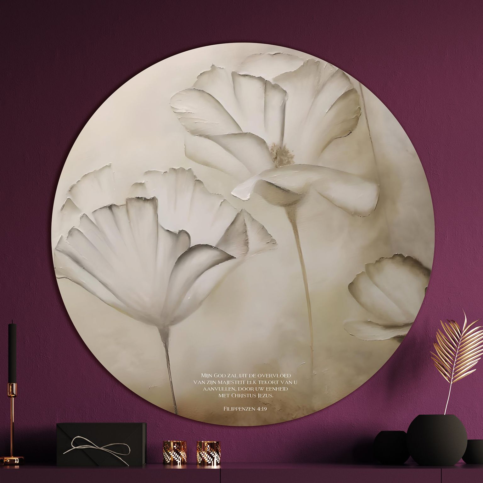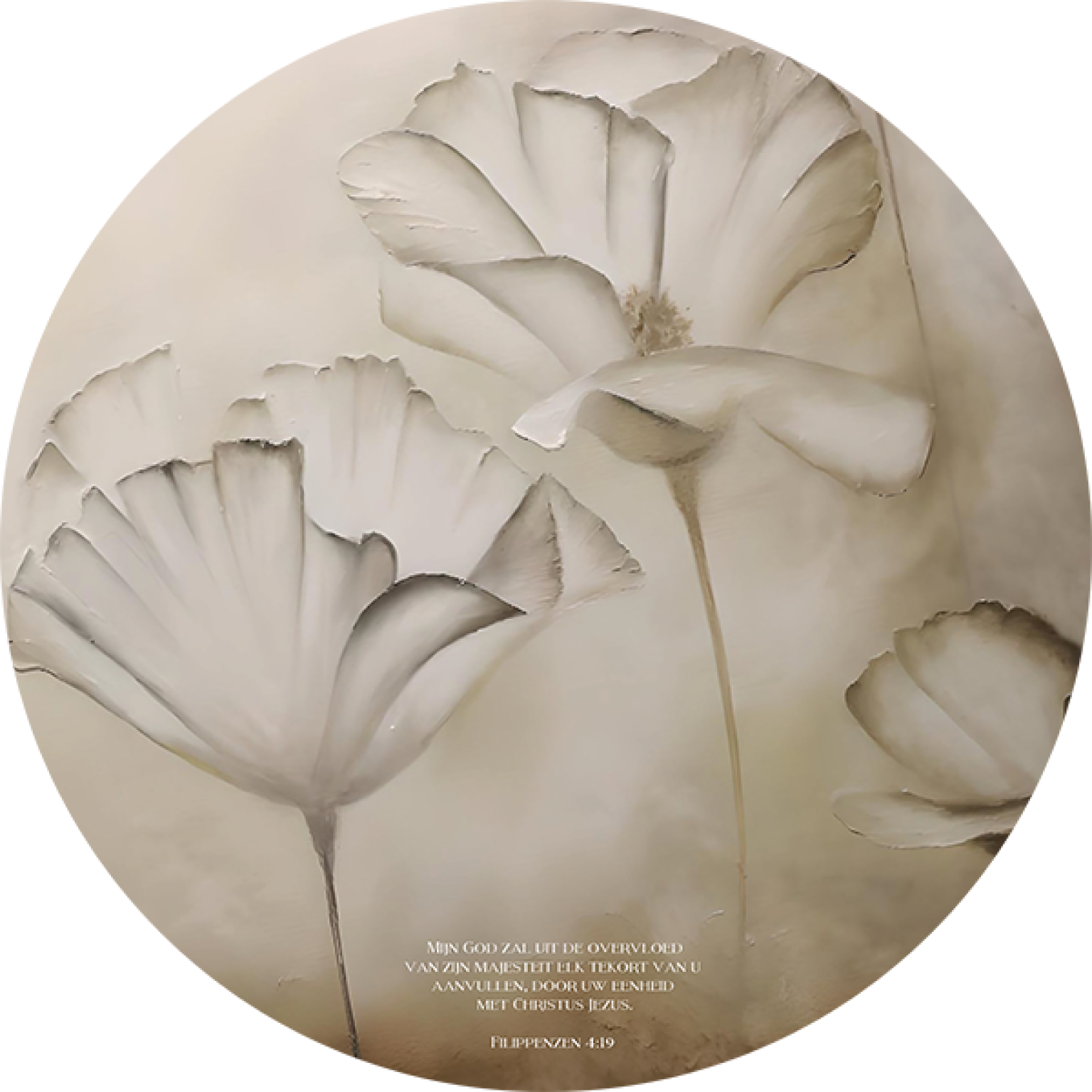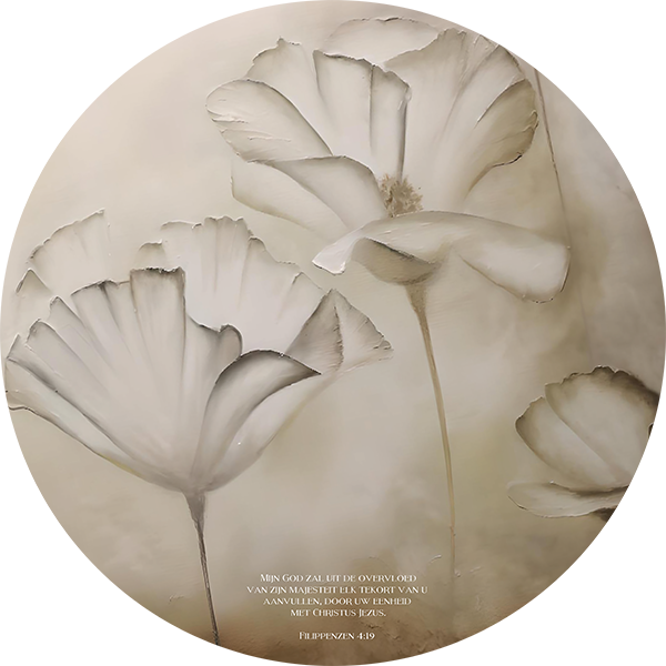 Op deze cirkel staat de bijbeltekst uit Filippenzen 4:19: ‘Mijn God zal uit de overvloed van zijn majesteit elk tekort van u aanvullen, door uw eenheid met Christus Jezus.’