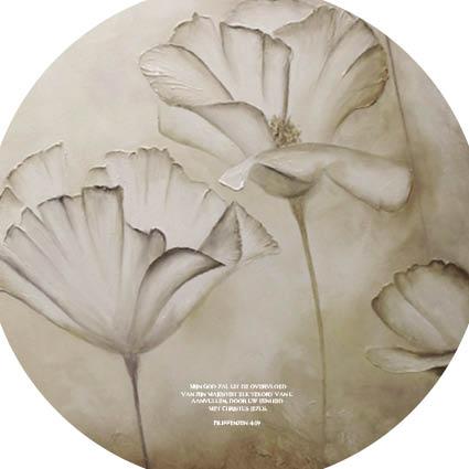 Prachtige ronde muurdecoratie met een afbeelding van witte klaprozen en de bijbeltekst uit Filippenzen 4:19.