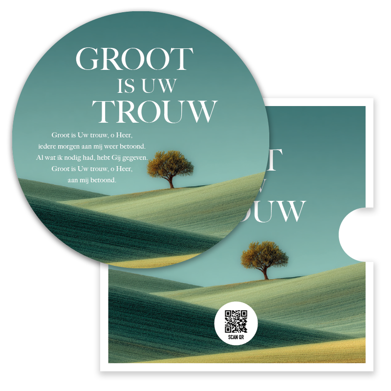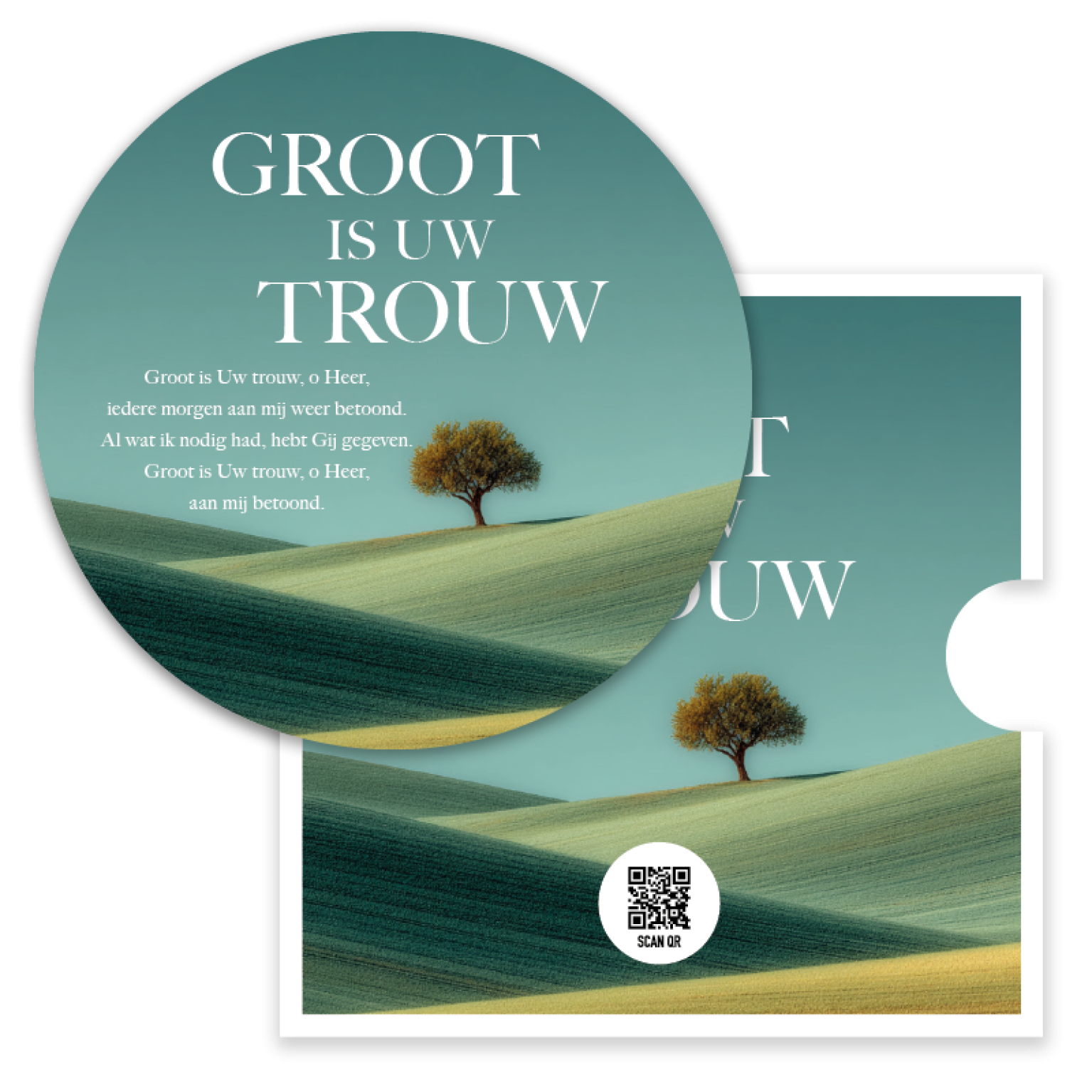 Deze ronde kaart bevat de tekst uit Opwekking 123: Groot is Uw trouw en is voorzien van een boom met heuvels. De kaart zit in een cd-hoesje met dezelfde afbeelding en een QR-code die verwijst naar het bijbehorende lied. Een tijdloze kaart die Gods trouw zichtbaar maakt.