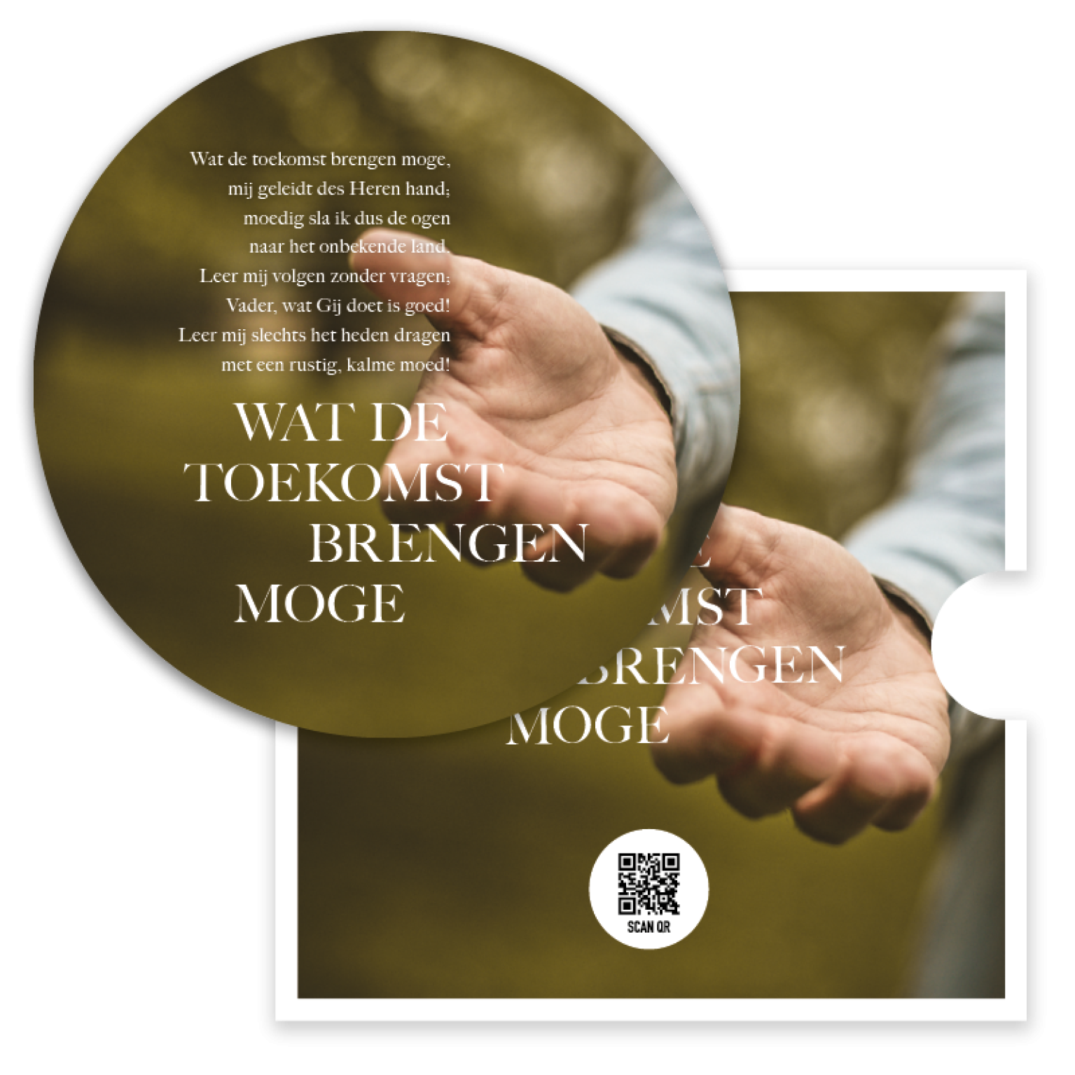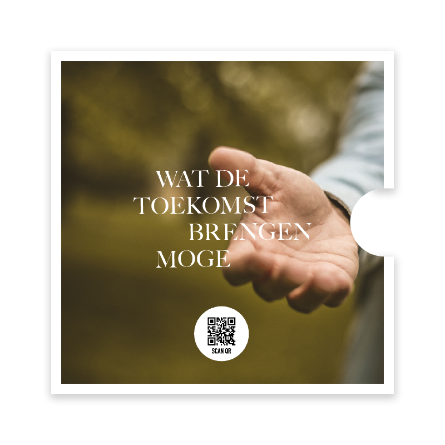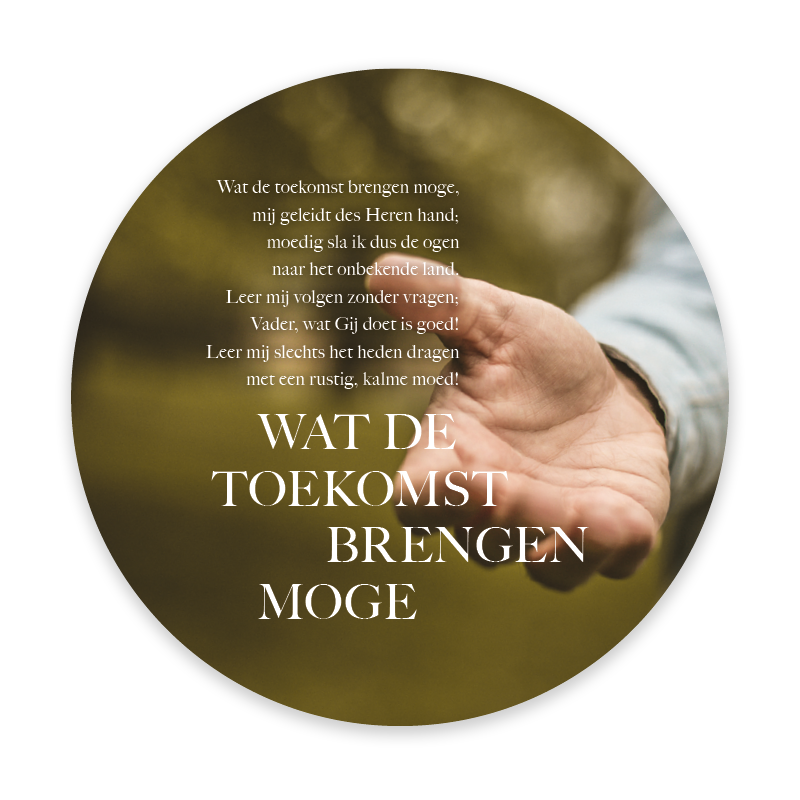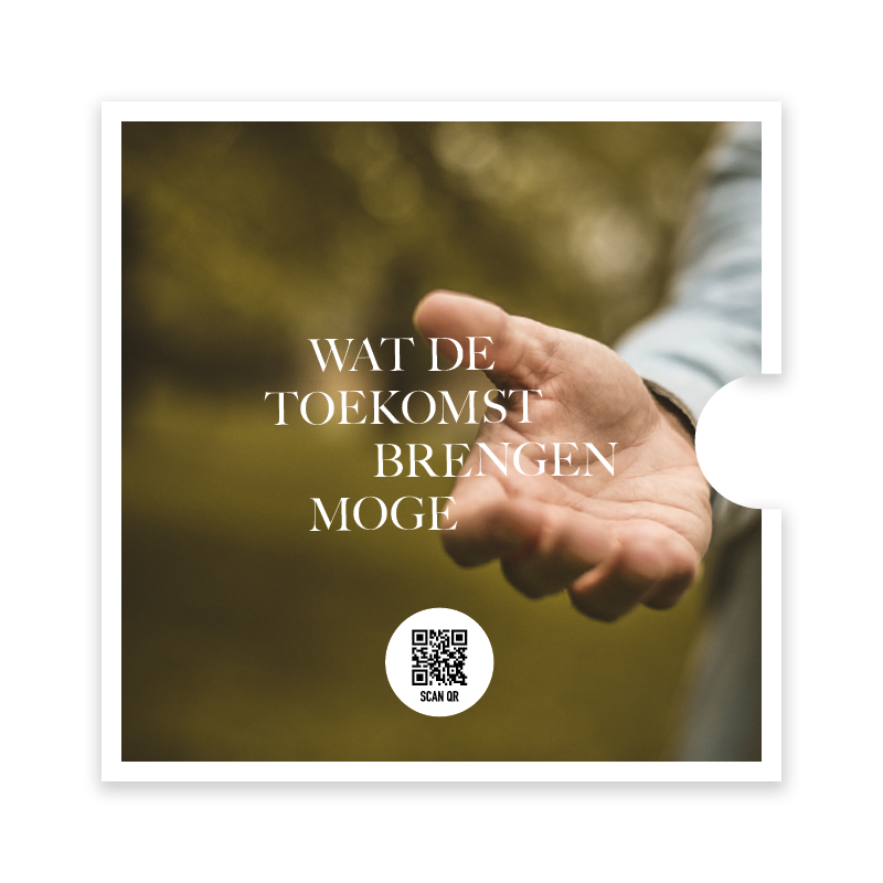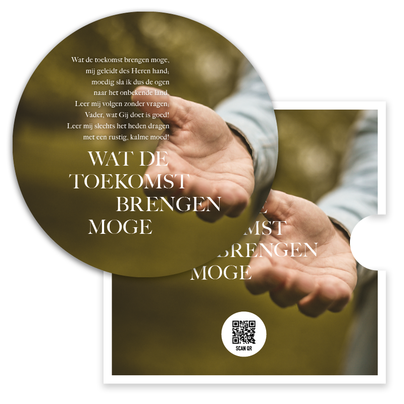 Prachtige ronde fotokaart met een afbeelding van een uitgestoken hand en de tekst ‘Wat de toekomst brengen moge’. Deze bijzondere kaart is verpakt in een stijlvolle singlehoes en bevat een QR-code die direct leidt naar het muziekbestand van Opwekking 377. Een waardevol cadeau of bemoedigende kaart om hoop en vertrouwen te delen.