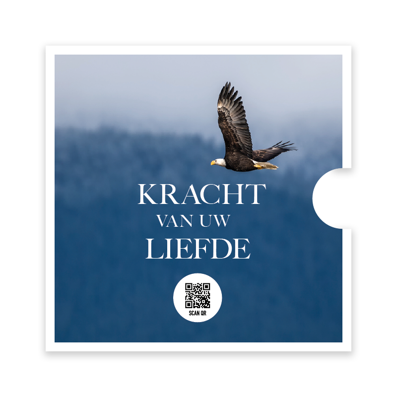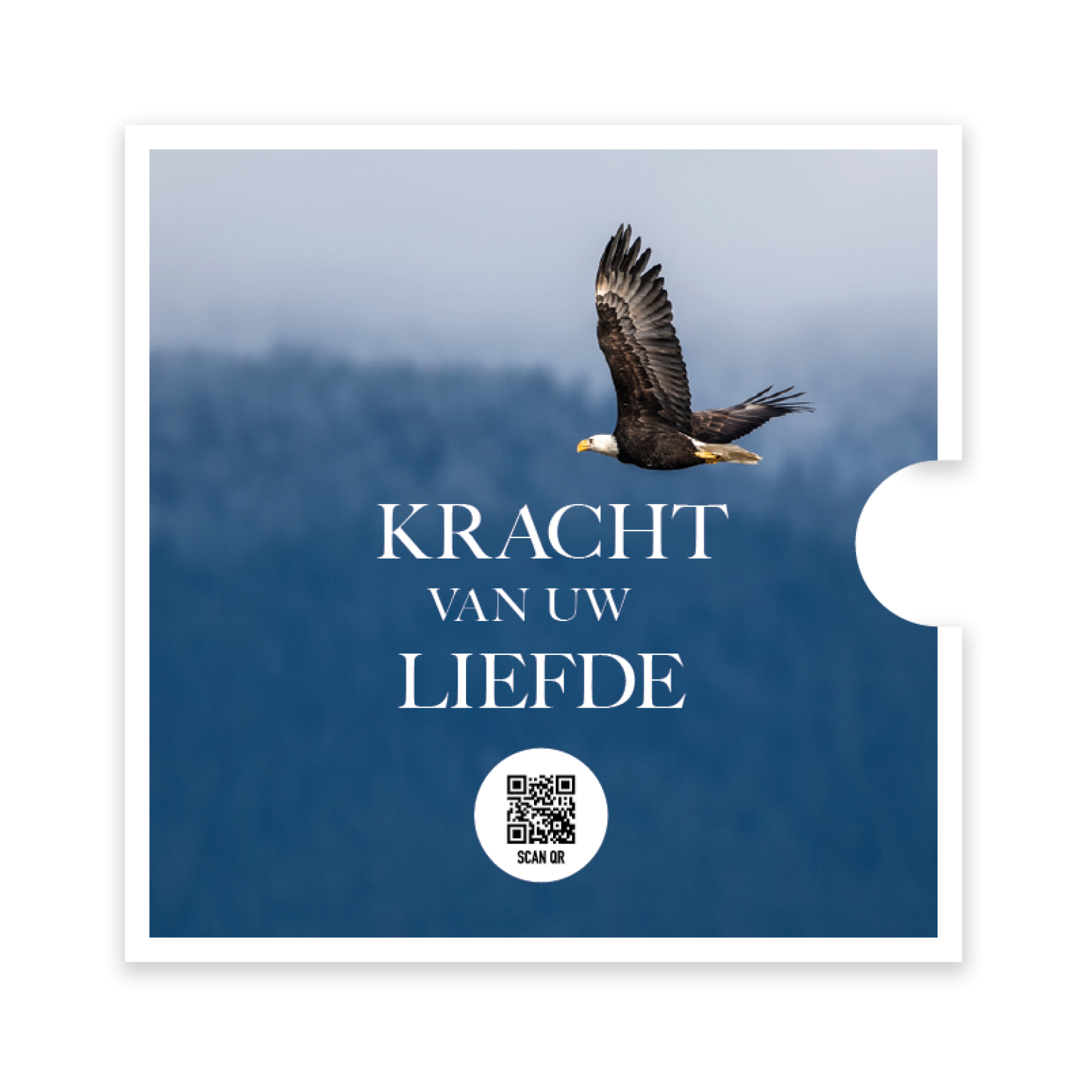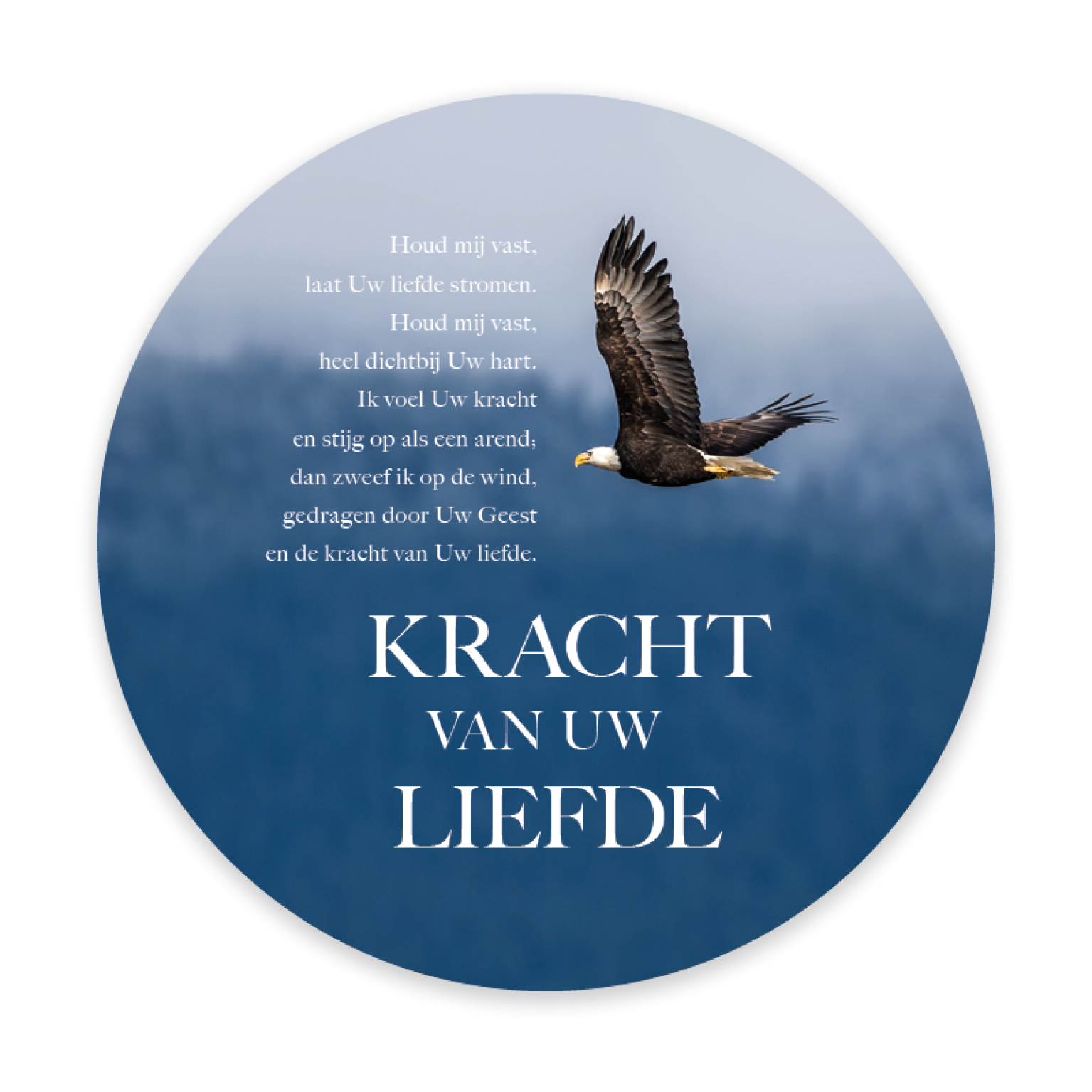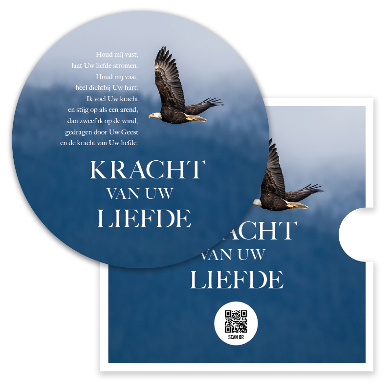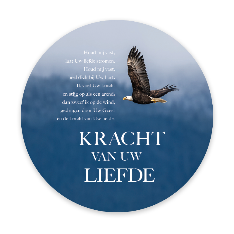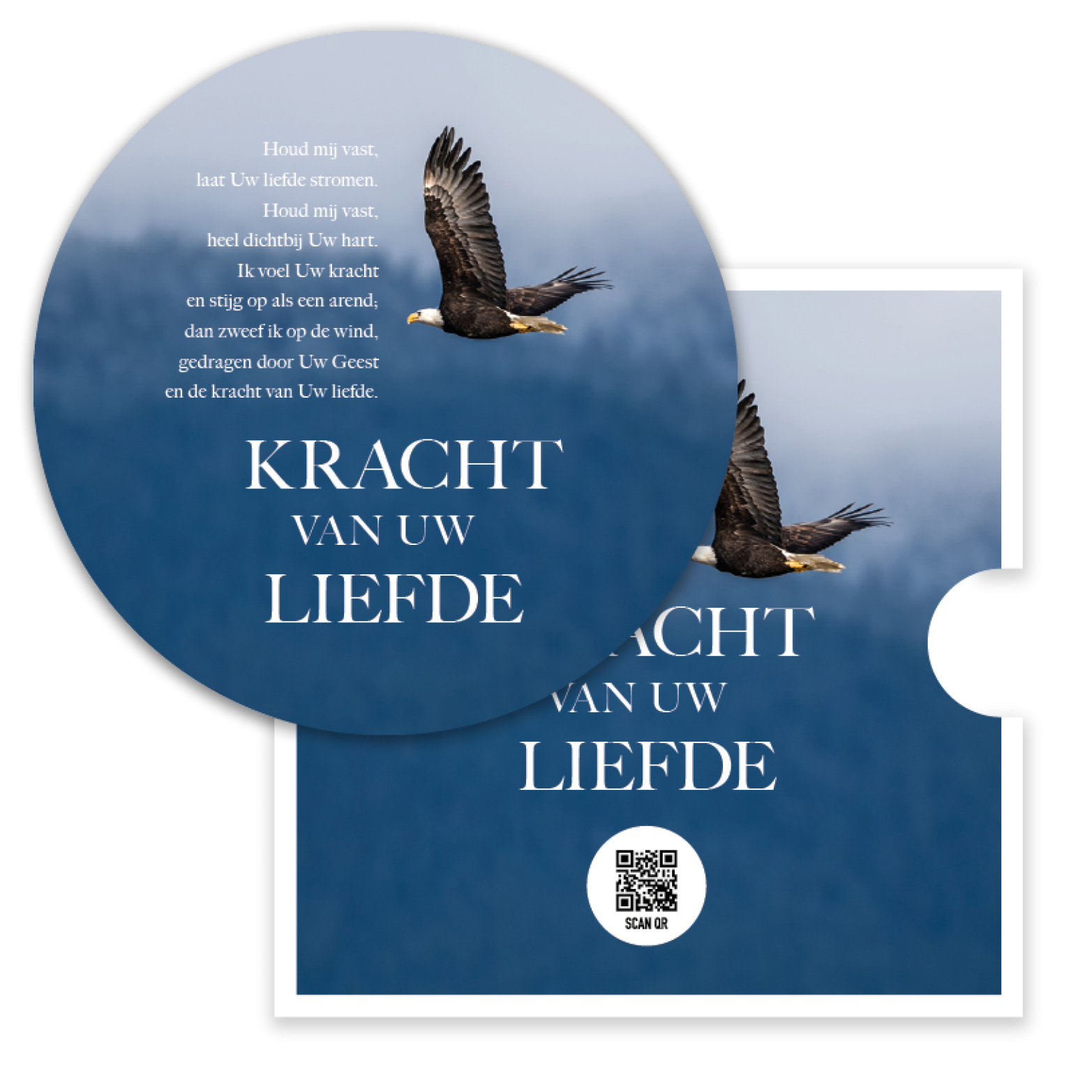 Prachtige ronde fotokaart met de tekst ‘Kracht van Uw liefde’ en een indrukwekkende afbeelding van een arend die door de lucht zweeft. Een bemoedigende kaart die herinnert aan Gods kracht en trouw. De kaart bevat een handige QR-code die direct linkt naar het muziekbestand van Opwekking 488.
