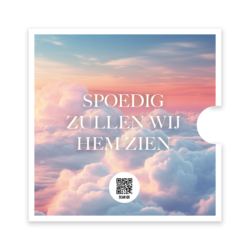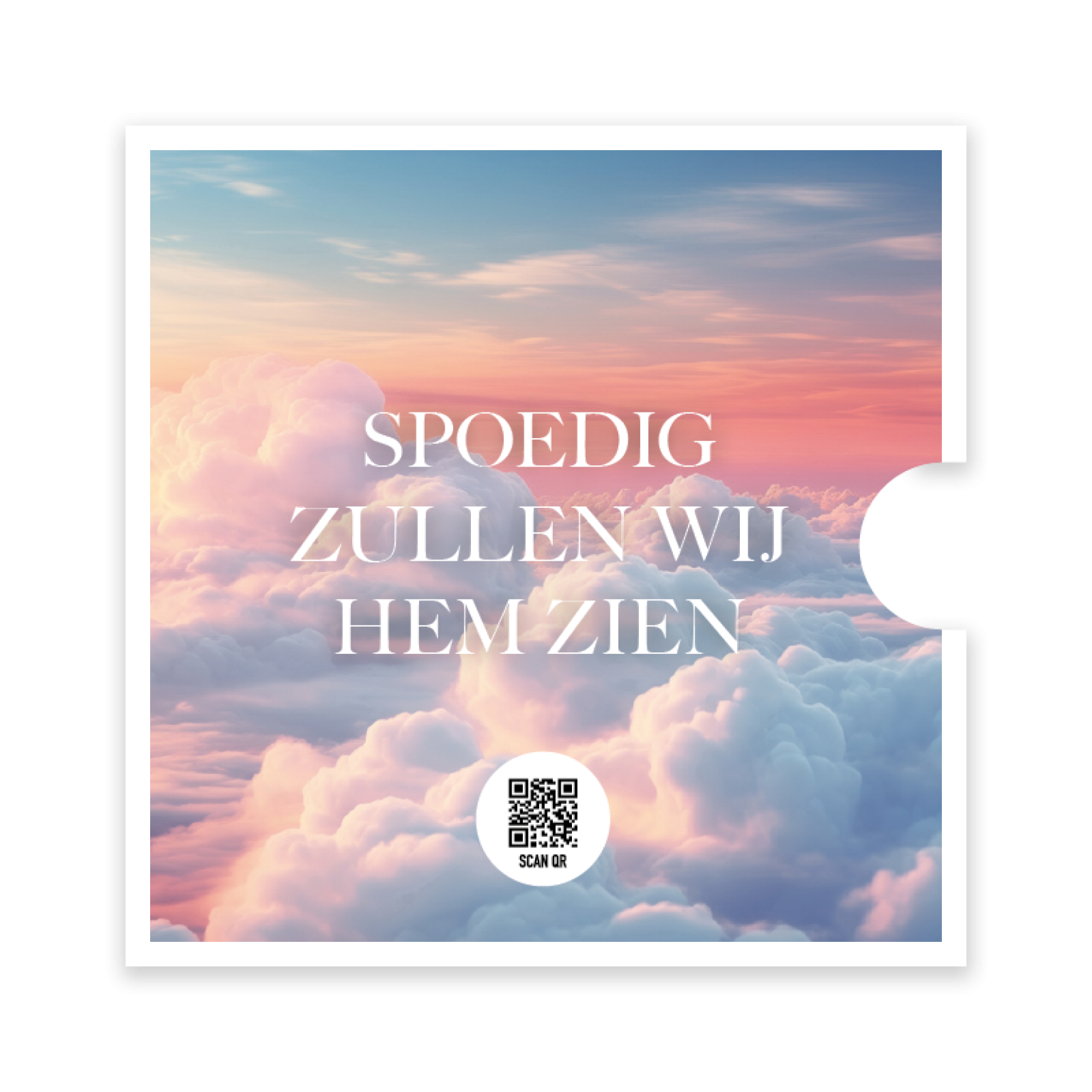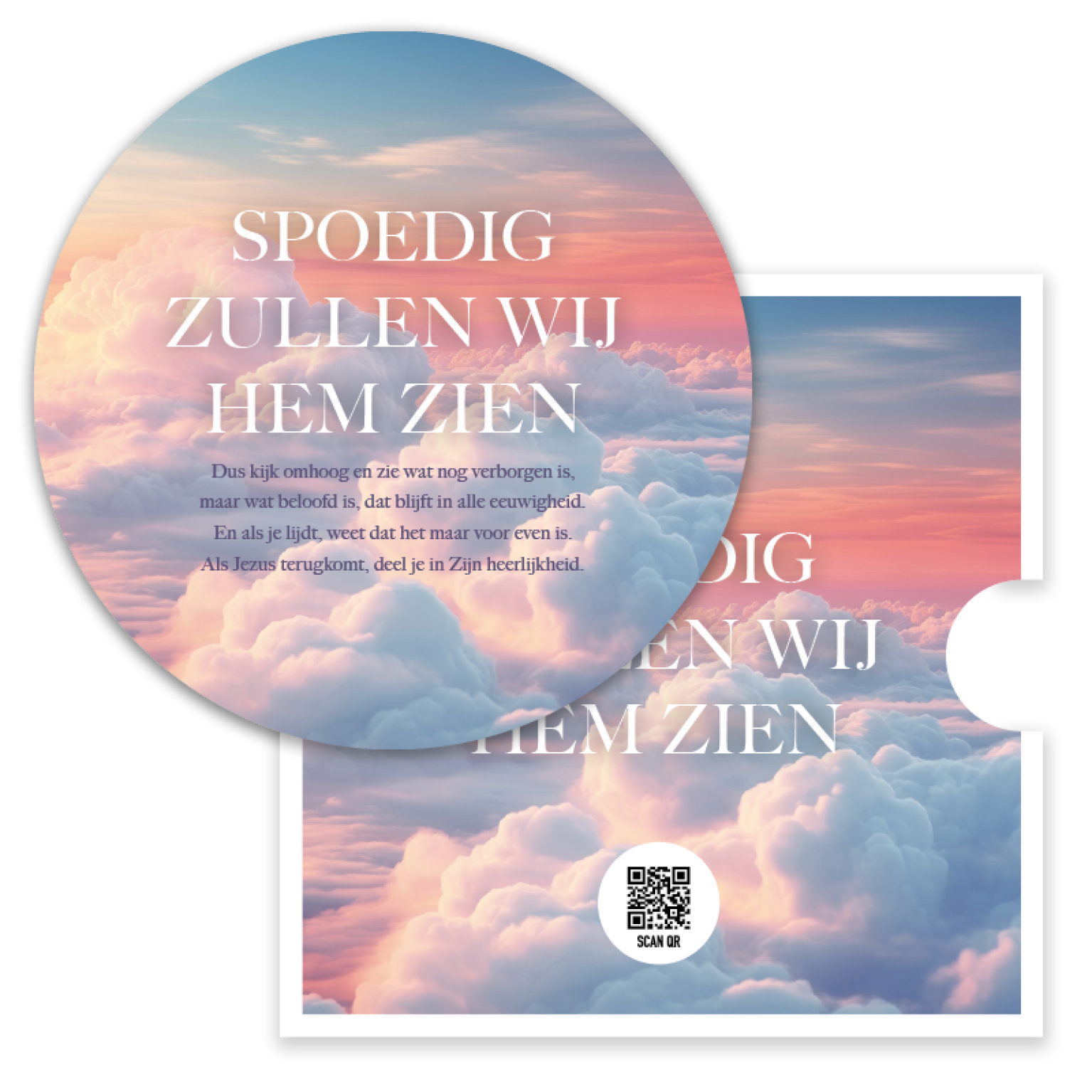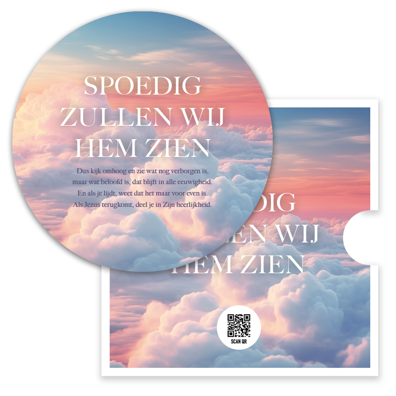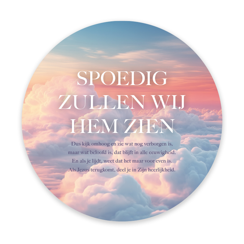 Prachtige ronde fotokaart met de tekst ‘Spoedig zullen wij Hem zien’ en een achtergrond van indrukwekkende wolken. Deze kaart verwijst naar het hoopvolle lied over Jezus’ terugkomst en is bedoeld als bemoediging en getuigenis van geloof.