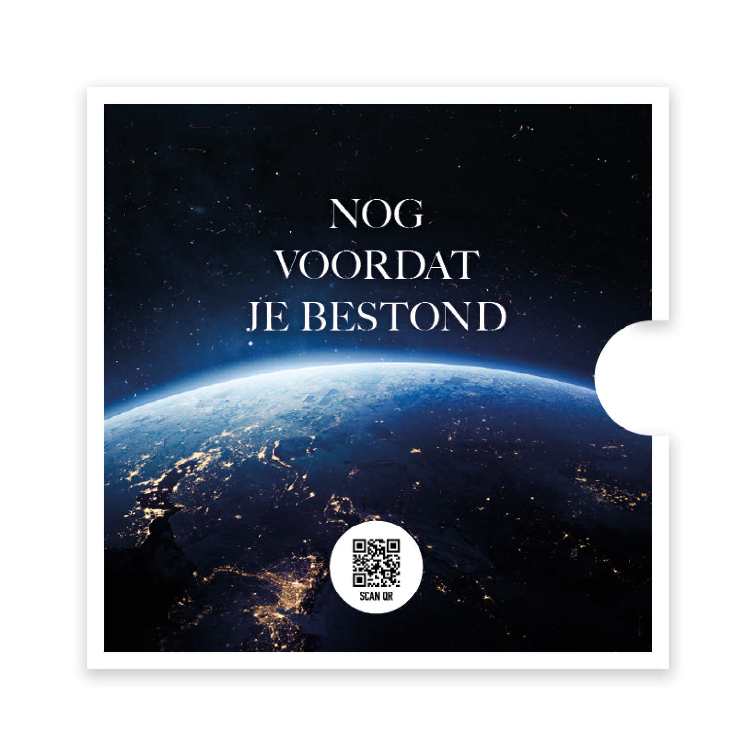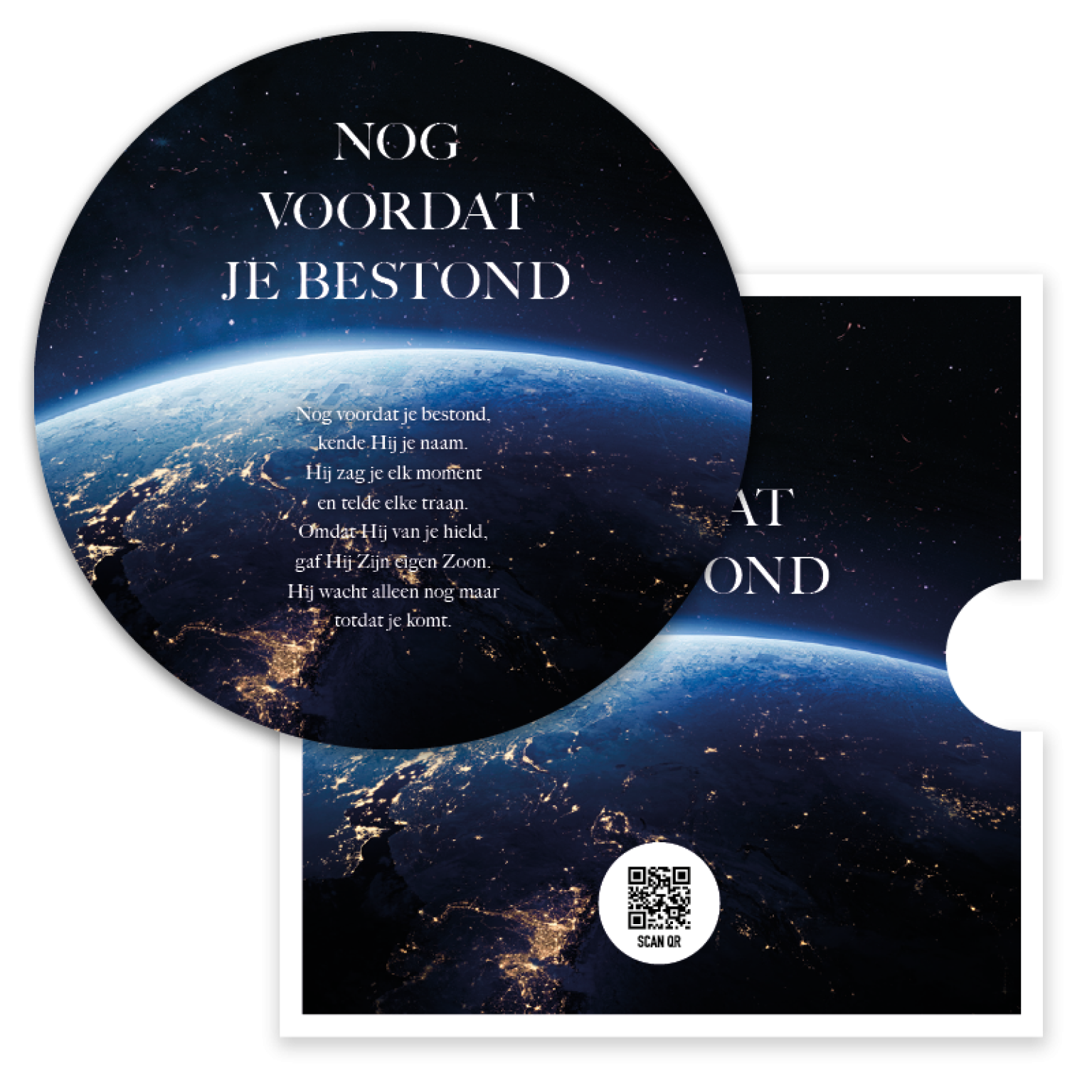 Prachtige ronde fotokaart met op de achtergrond de wereldbol. De kaart is verpakt in een stijlvol singlehoesje met de tekst ‘Nog voordat je bestond’. Een bijzondere kaart ter bemoediging die kracht en troost uitstraalt. De QR-code op de achterkant leidt direct naar het muziekbestand van Opwekking 599.