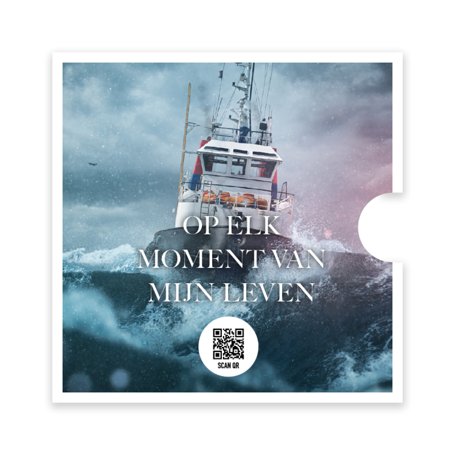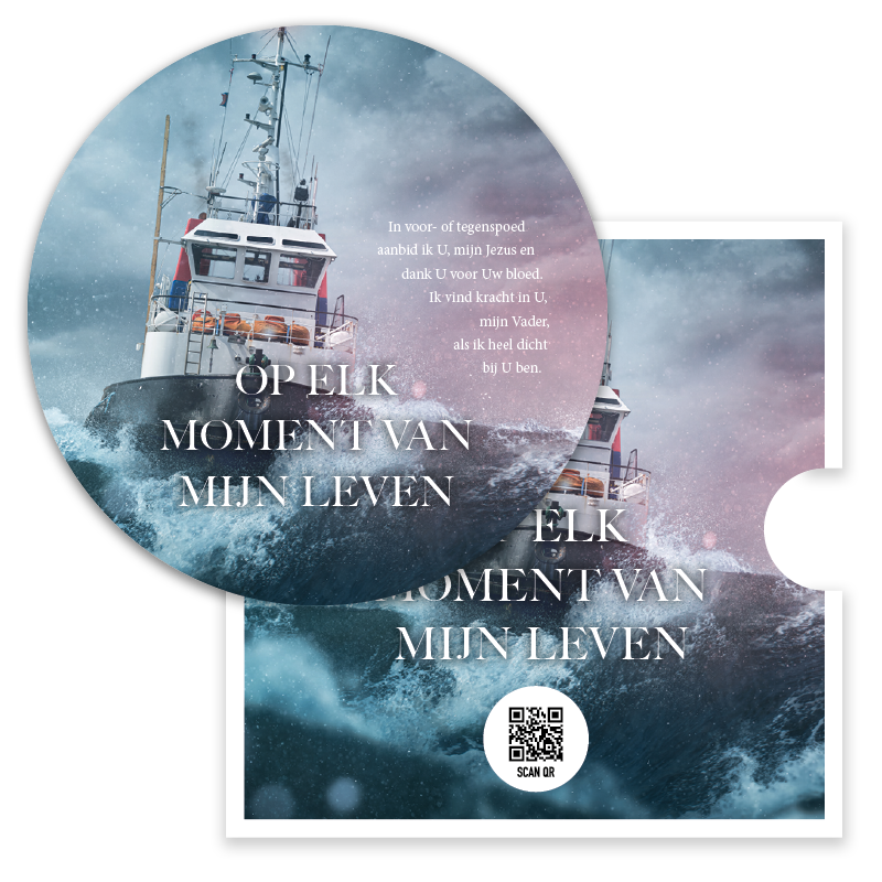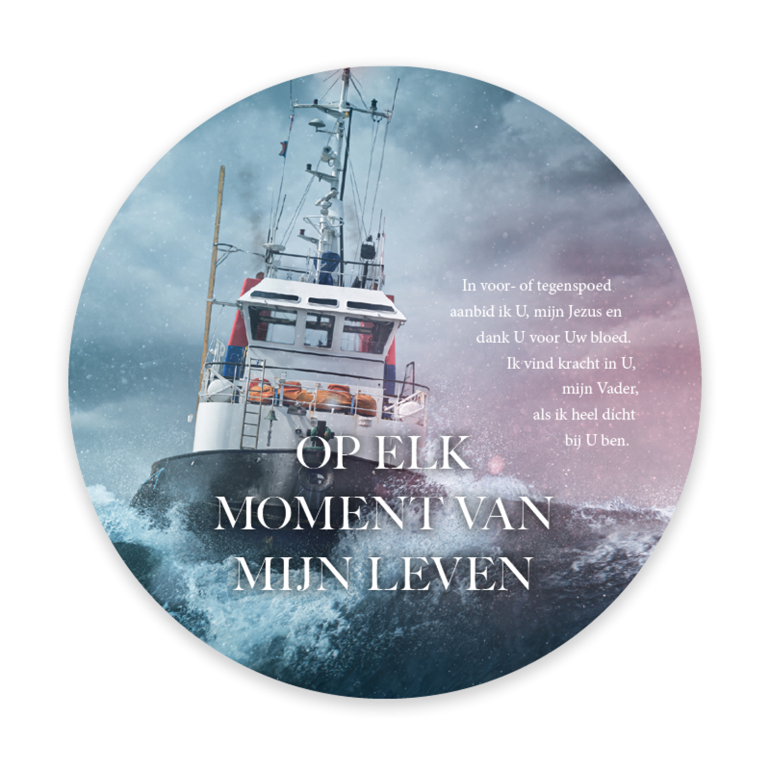 Prachtige ronde fotokaart met de tekst ‘Op elk moment van mijn leven’. Op de achtergrond is een indrukwekkend beeld te zien van een schip in de storm; een krachtig symbool van vertrouwen en hoop in moeilijke tijden. Deze bemoedigende kaart bevat een QR-code die direct leidt naar het lied ‘Opwekking 630’.